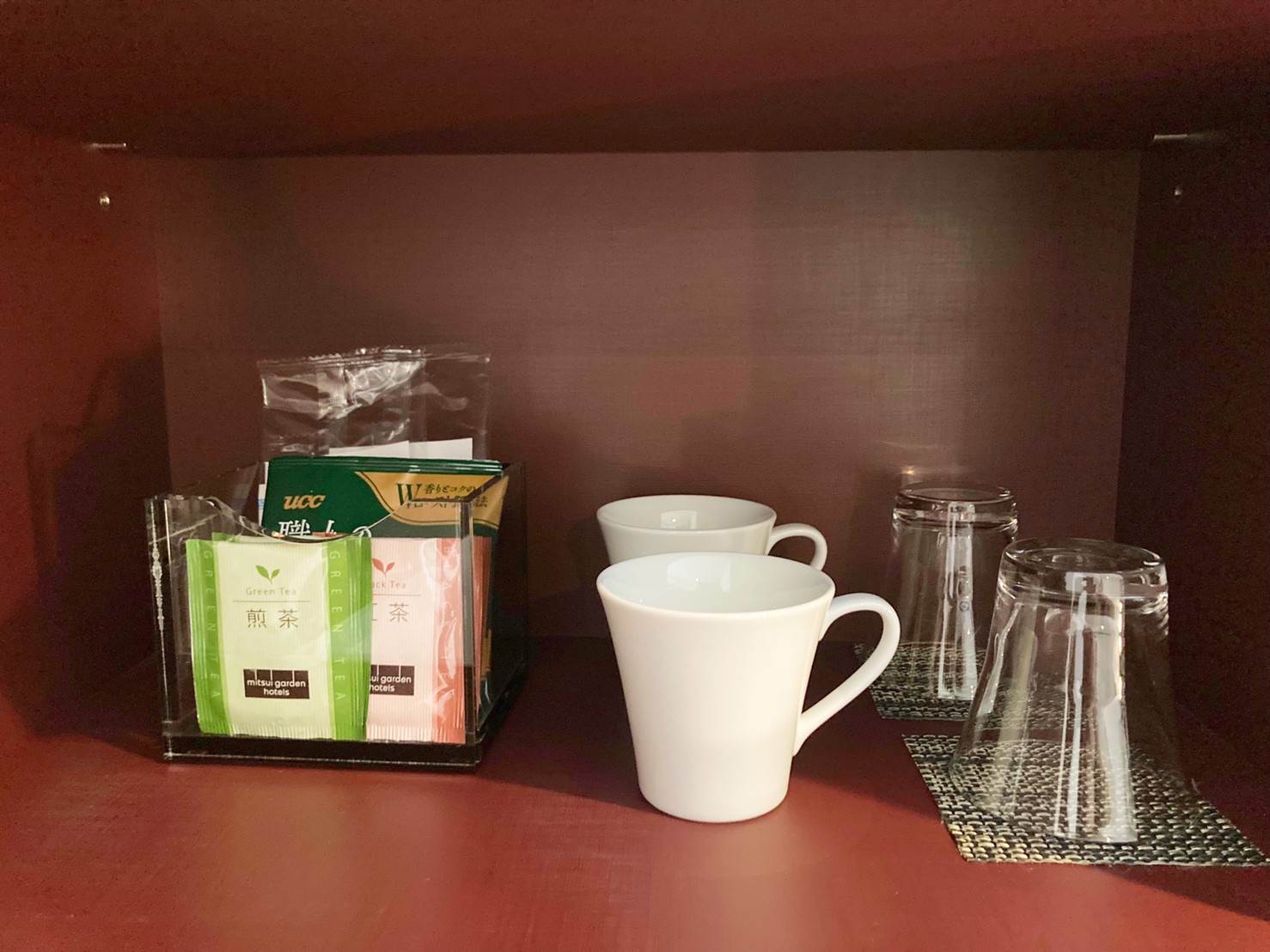 ▲コップ類はホット・アイスが人数分。おしゃれなコースター付きです。