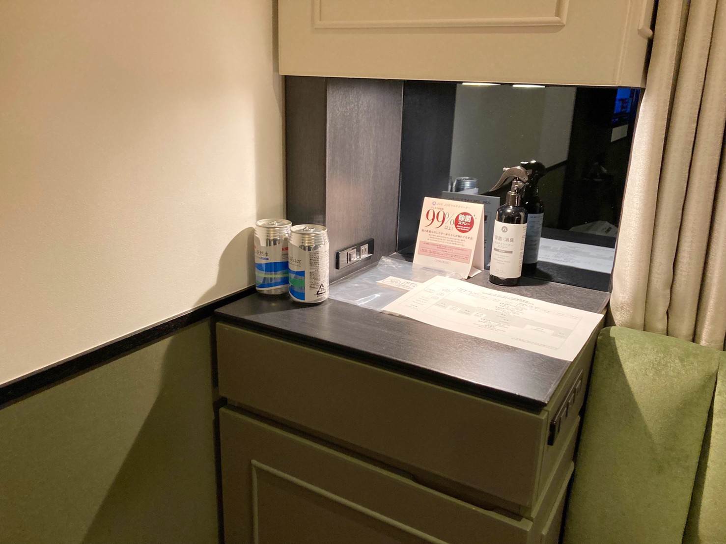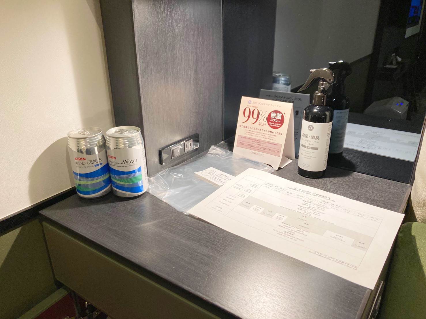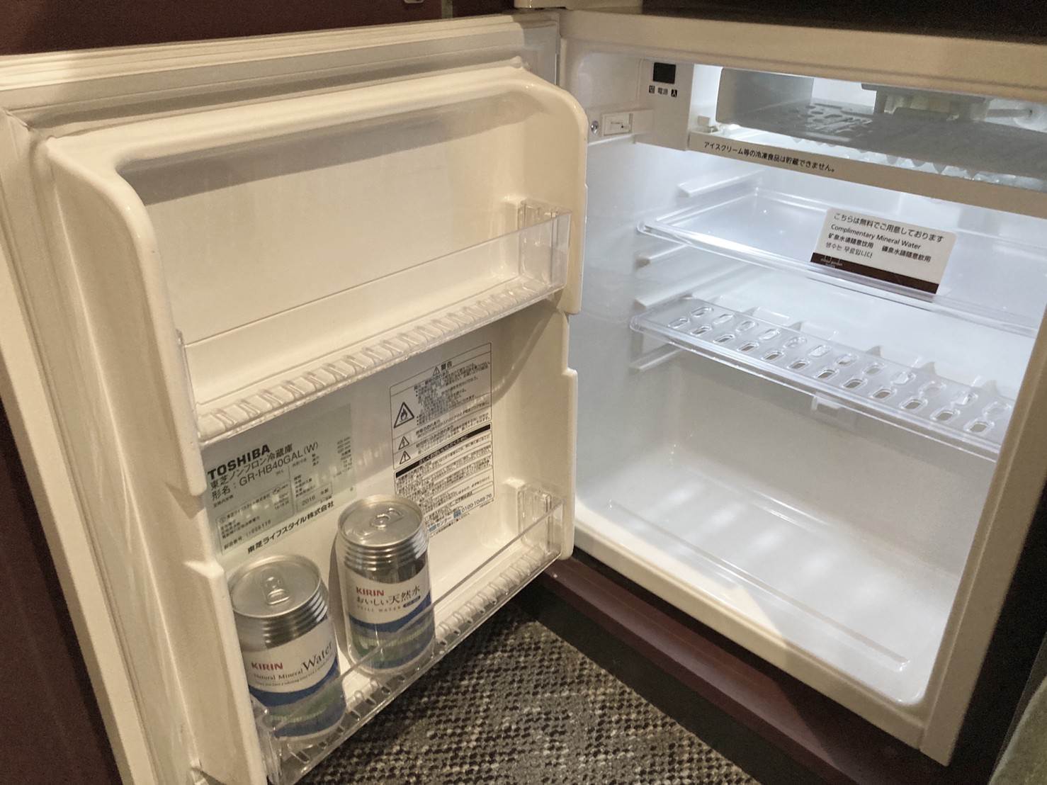 ▲冷蔵庫、棚の上のミネラルウォーターはプレゼント!三井ガーデンホテルではもはやおなじみになった消臭・除菌スプレーも完備されています。