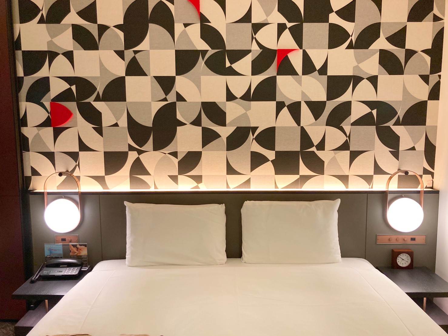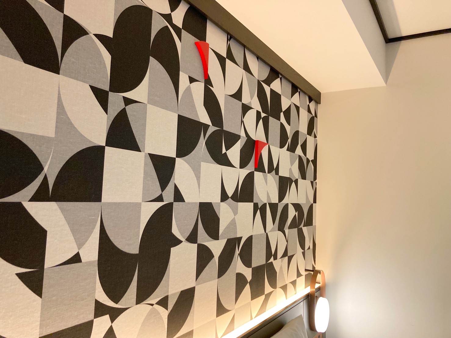 ▲ベッド側の壁も幾何学模様スタイル!これ実は、赤い部分が3Dになっているんです。