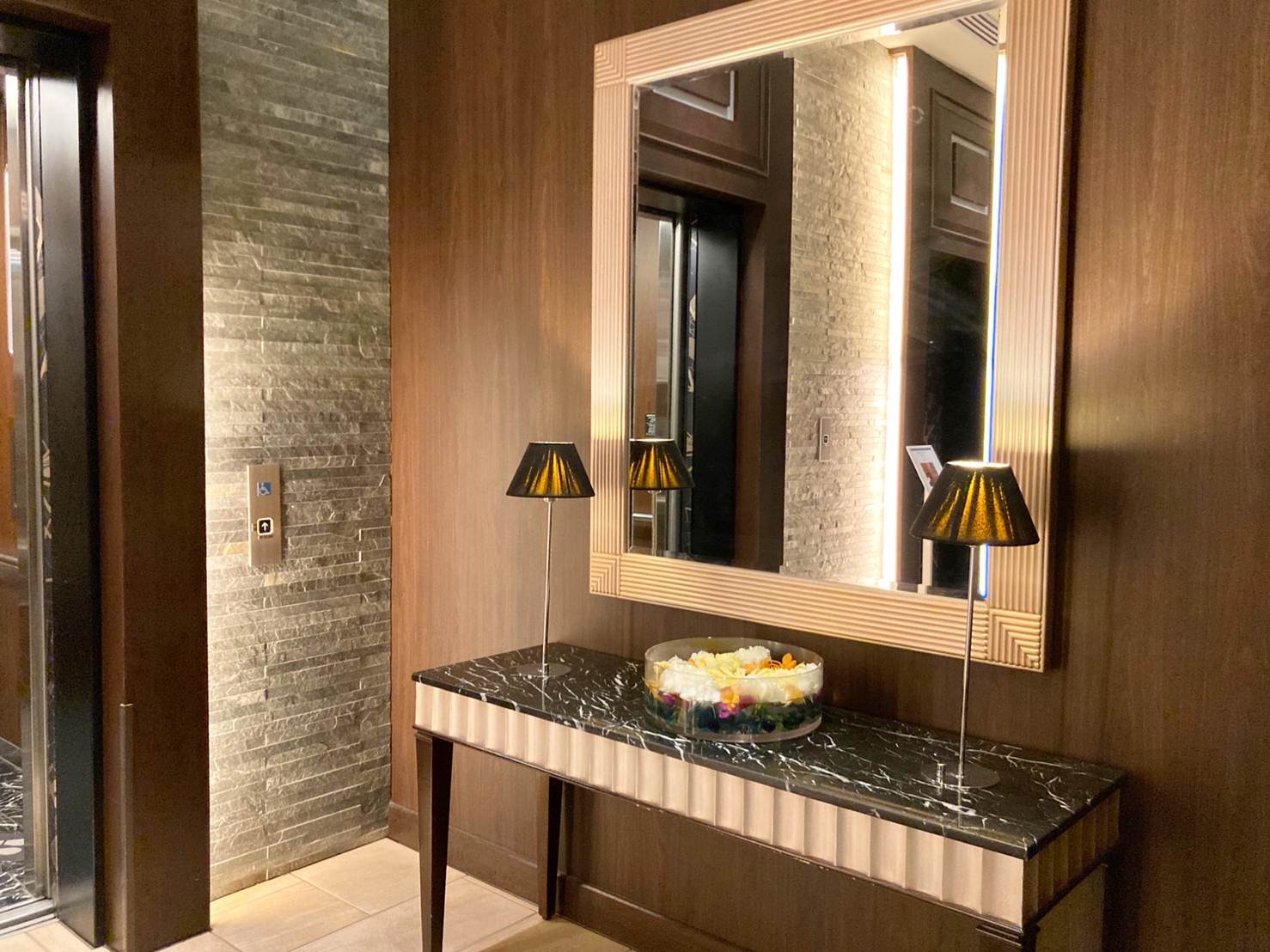 ▲こちらはエレベータ脇の鏡ですが、こちらもとってもおしゃれ!記事を書く身としては、このあたたかな間接照明の雰囲気が好きです。写真写りが良い…。