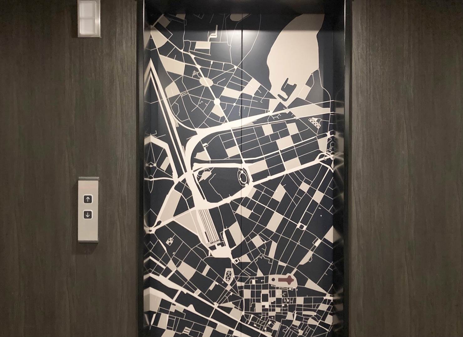 ▲エレベータにはこんな幾何学模様が描かれています。おそらくこれは汐留の街の地図…かな?