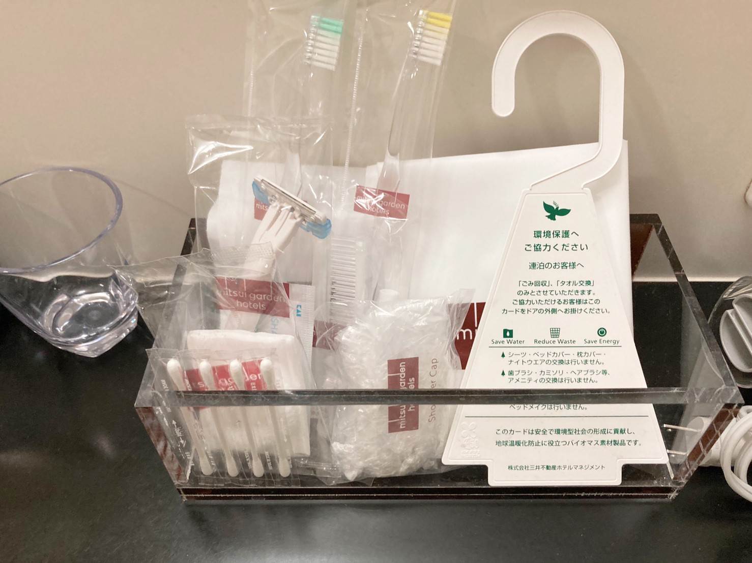 ▲バスアメニティは同じく洗面台に一通り用意されています。ちょっとありがたいのは三井ガーデンホテルの専用袋。後ほど紹介する大浴場に移動する際に重宝します…