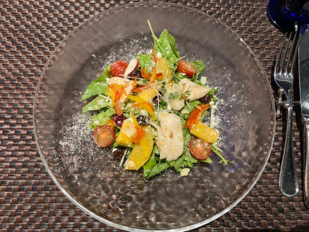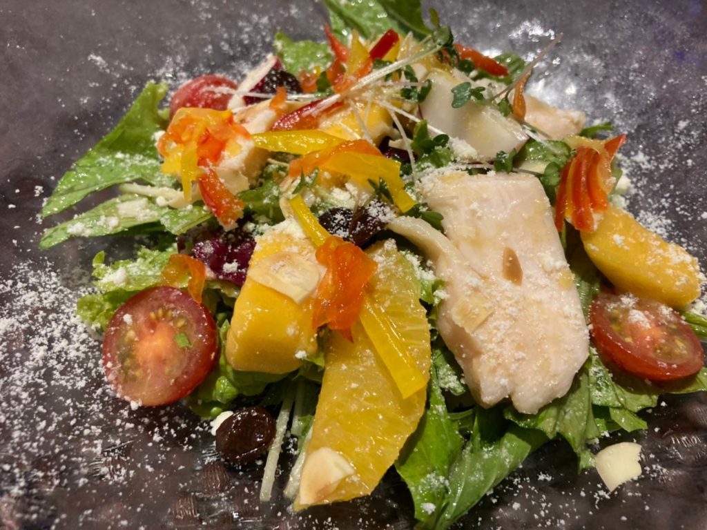 また、色々野菜の他に、マンゴーやオレンジなどのフルーツが2切れずつに、蒸し鶏、アーモンドのチップが使われており、一口食べるごとに味の変化も楽しめました。