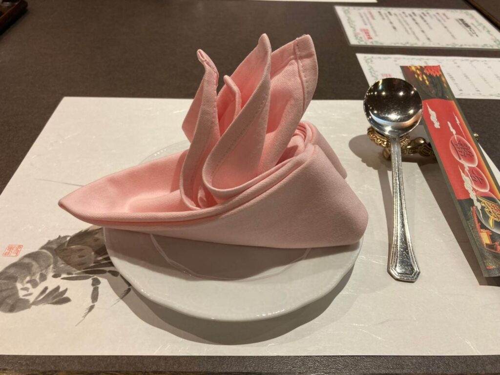 ピンク色のナフキンが映える!!というのはもちろんのこと、中華料理らしい柄があしらわれた紙に、お箸・スープ用スプーンが用意されていました。