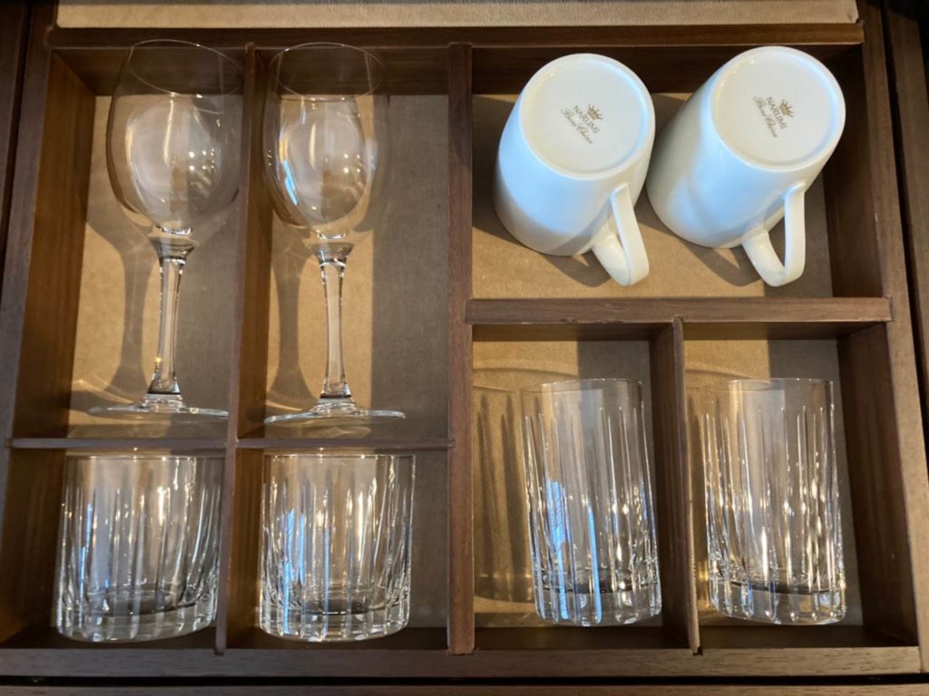 まず、テレビの下の引き出しには、グラス類の備品がズラッときれいに並んでいました。