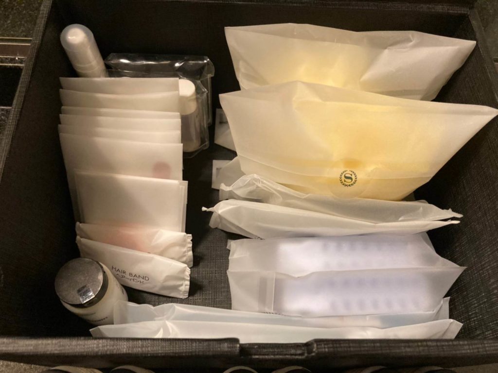 主なアメニティ(歯ブラシ・ブラシ等々)はまず一通り揃っており、バスルームの洗面台横の箱に入っています。