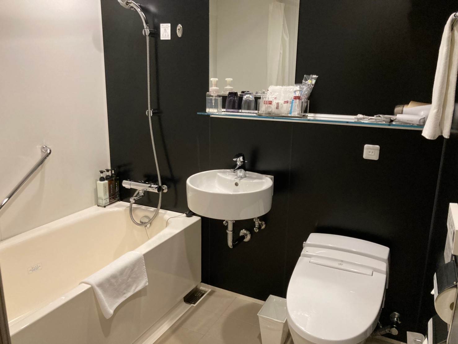 マイナスポイントは、バスアメニティ等々が用意されている棚がガラス製でおしゃれはおしゃれなのですが、スペースが小さく着替え等がおけなかったのが少々厄介だったことですね。