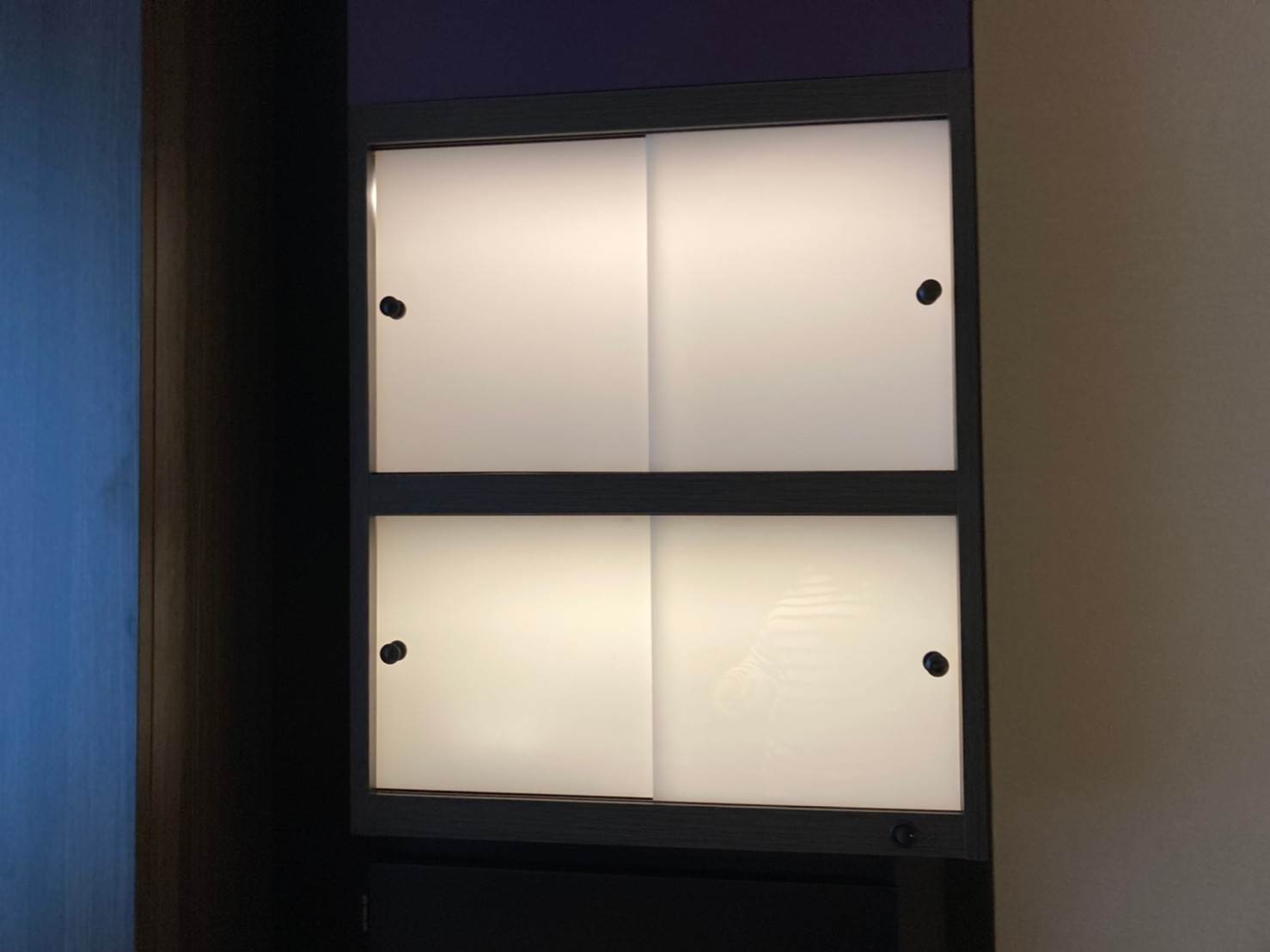 上の写真だとわかりにくいんですが、この白い部分は実は障子を模していて、スイッチを押すと光る(電気がつく)仕様になっているんです。