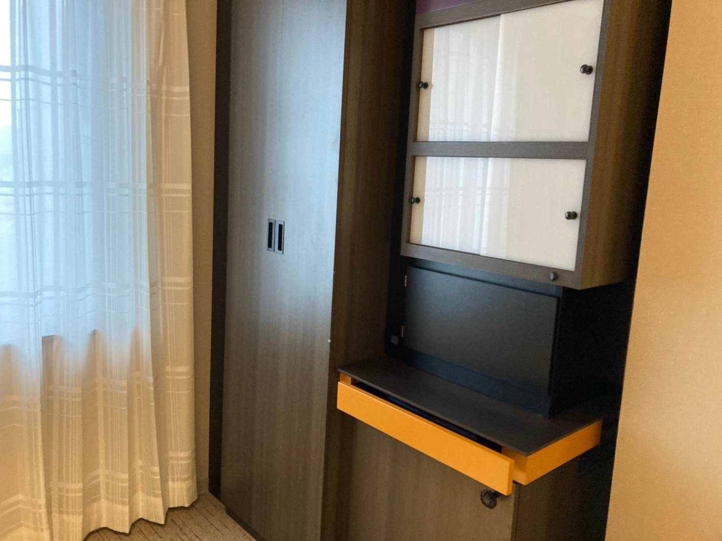 クローゼット・棚・引き出し、そして下には冷蔵庫とホテルの客室に必要な備品がすべてコンパクトに纏まっています。