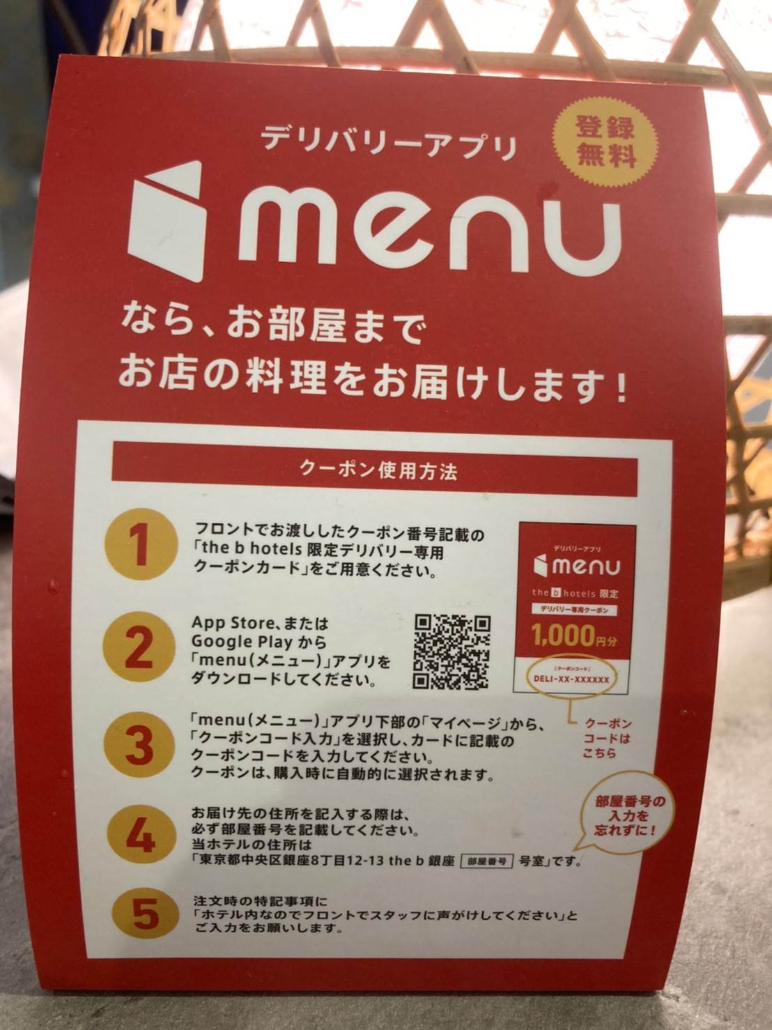 さらに、今だけかもしれませんがフロントではmenuの1,000引きクーポンももらえていたれりつくせりの状態です。