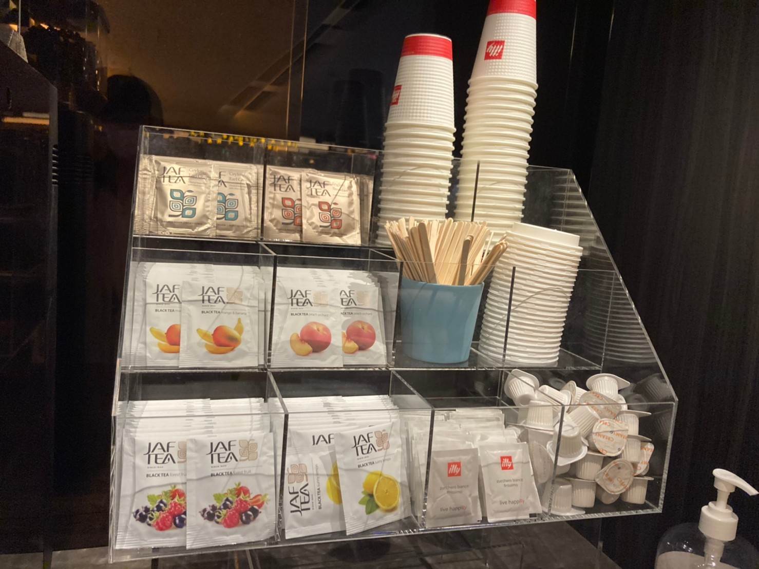 さてこのスペースの存在もさることながら、ラウンジの端には紅茶のティーバック&コーヒーマシンが用意されており、宿泊客は自由に利用可能となっているんです。