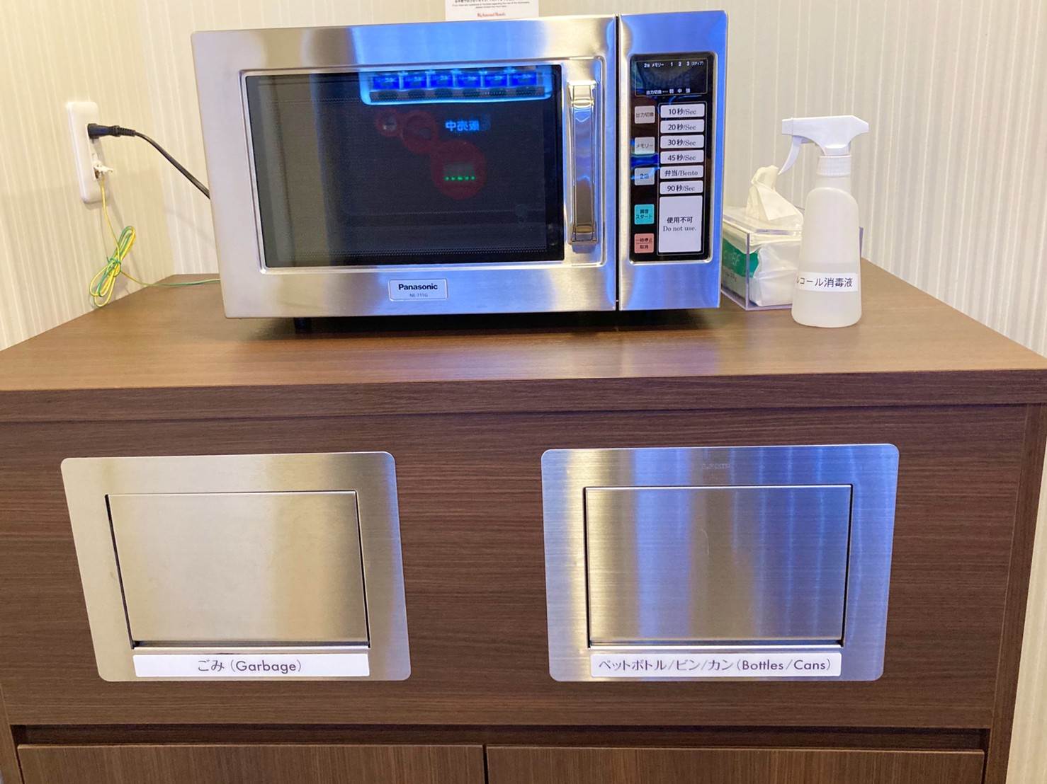 まずは電子レンジ。消毒スプレーやゴミ箱もあるのが高ポイント。