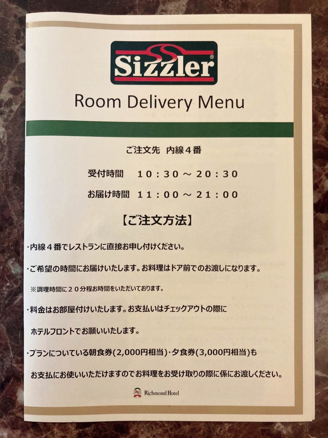 ホテル内にシズラーがあることで何が良いかというと、なんとルームデリバリーサービスを実施していることです。