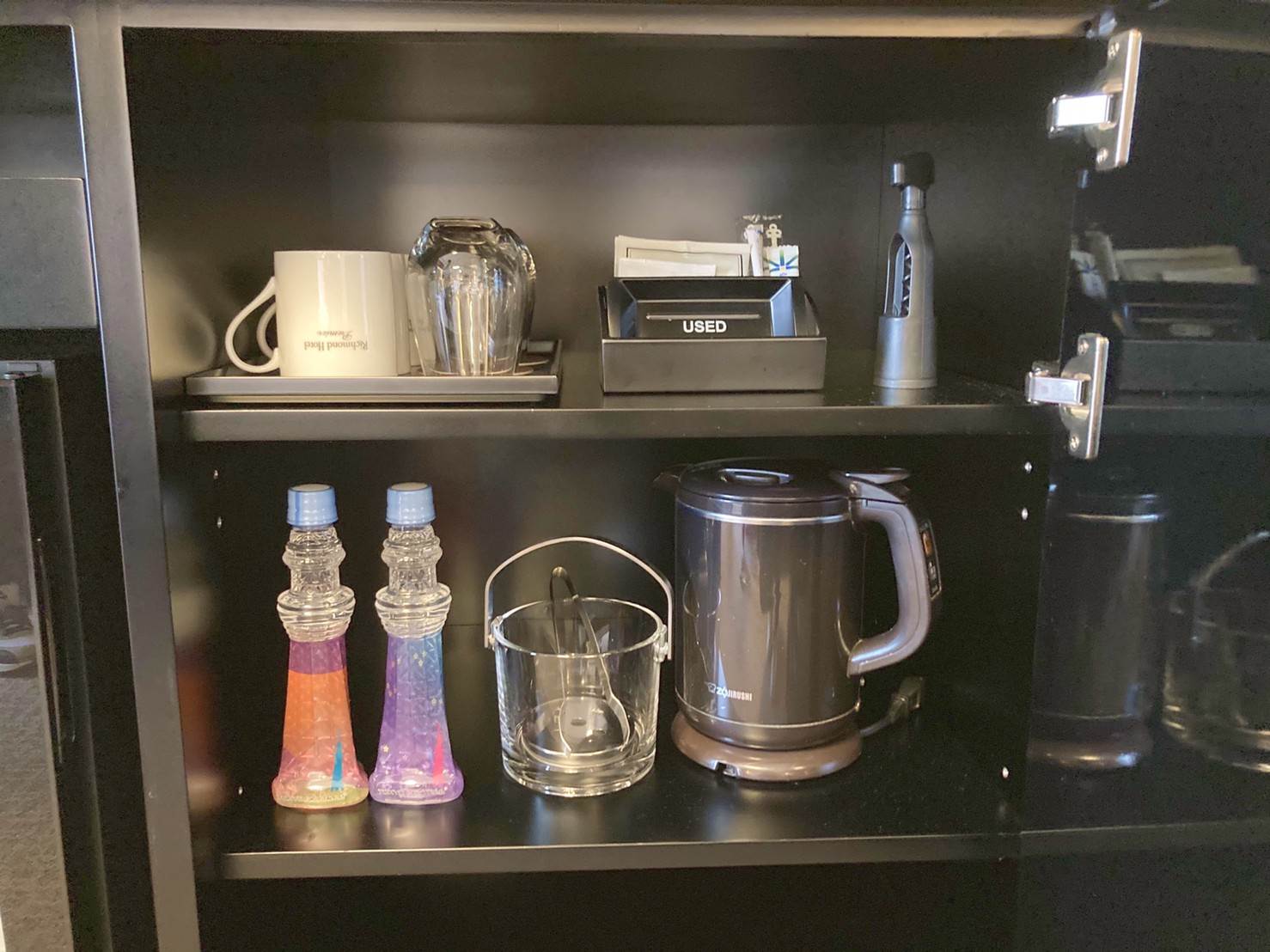 飲み物関連の備品は金色に縁取られたテレビのお膝元に一通り用意されています。