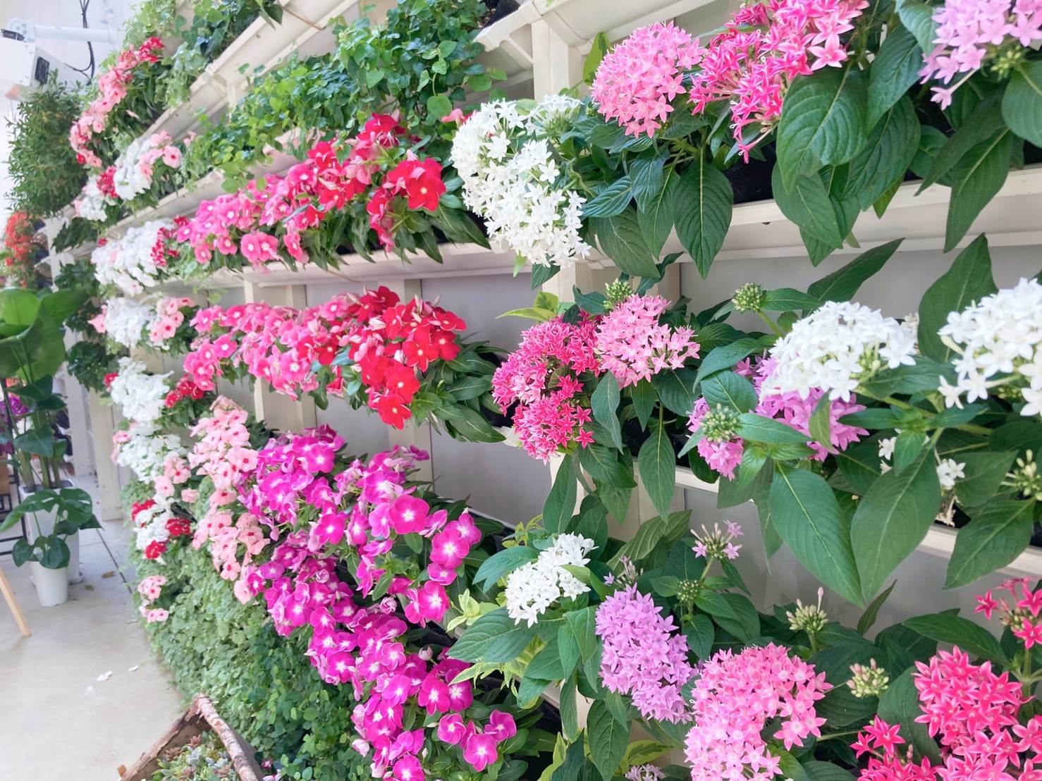 まるでビニールハウスのようだった前者と比較し、紺色に彩られたモダンな雰囲気あふれる施設の外観のそばに季節の花々が飾られています。