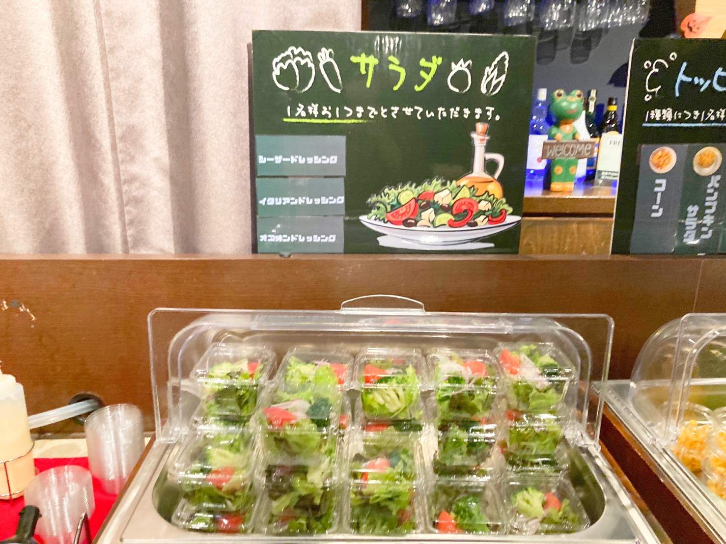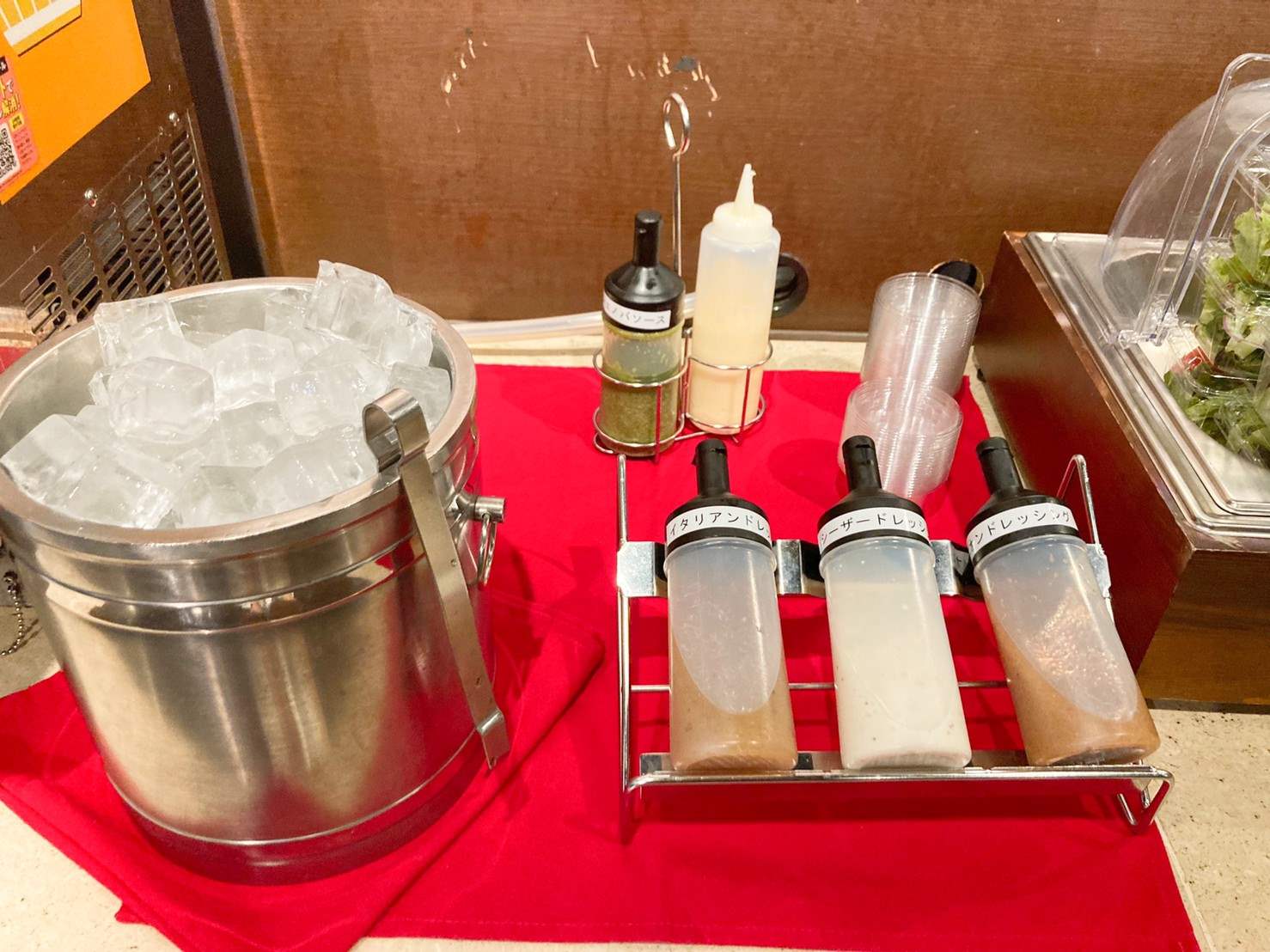 ▲サラダのドレッシングは、イタリアン・シーザー・オニオンの三種類。奥のジェノバソース・マヨネーズもOKです◎