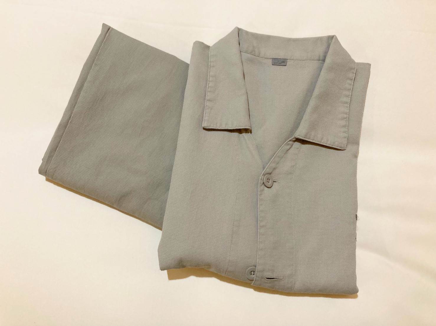 ▲館内着は上下セパレートタイプ。大浴場もこちらの服&スリッパで利用可能です。