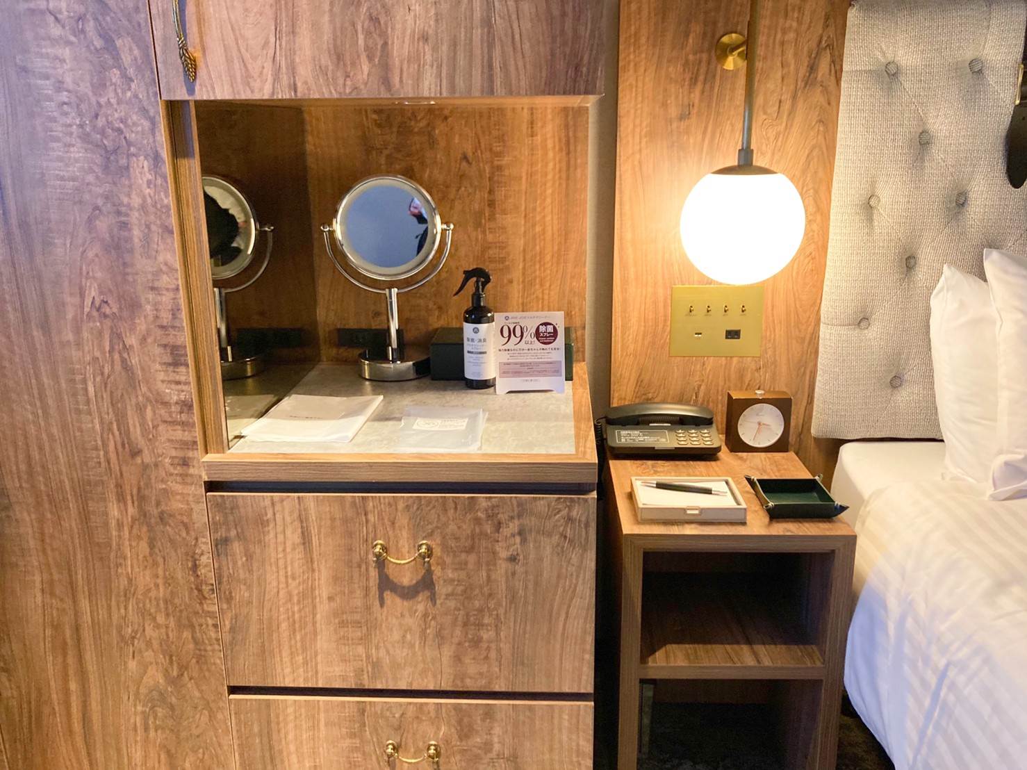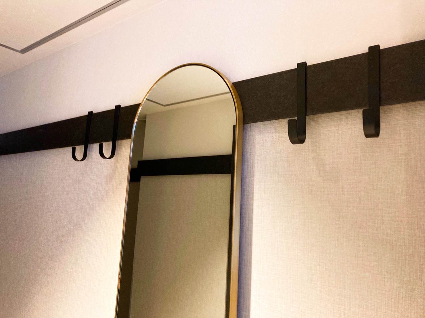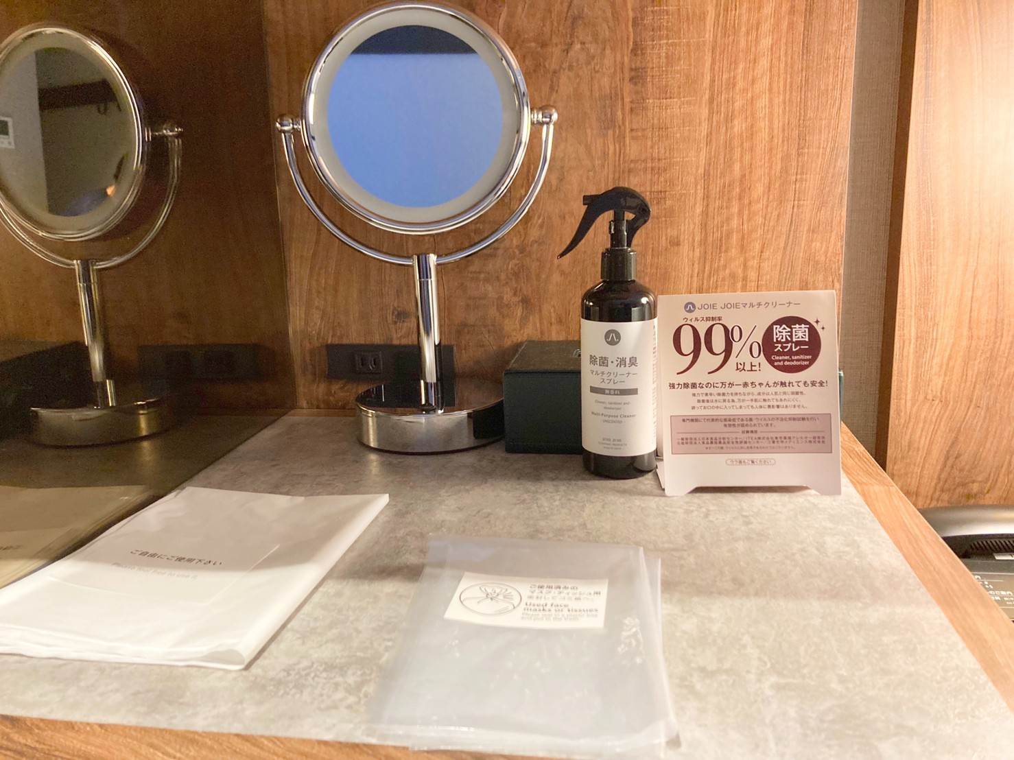 ▲その横には除菌スプレーや鏡が用意されていました。こちらの除菌スプレーも三井ガーデン系御用達。ジンギスカンの匂いが着いた洋服を見事に復元してくれました…!