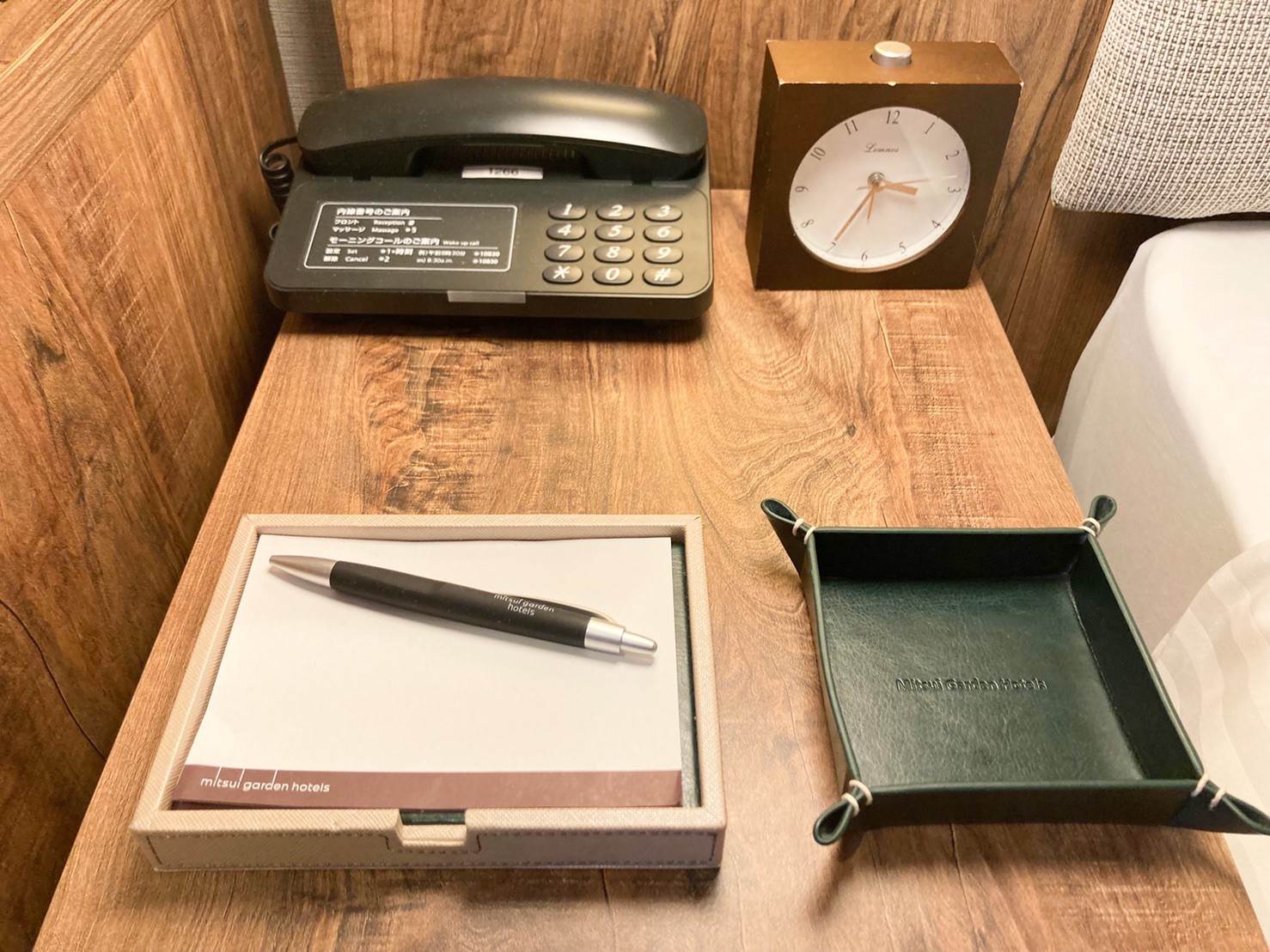 ▲ベッド横机には時計・電話・小物入れ・メモとペン。細かいアクセサリーを身に着けている身としては、小物入れがありがたい。