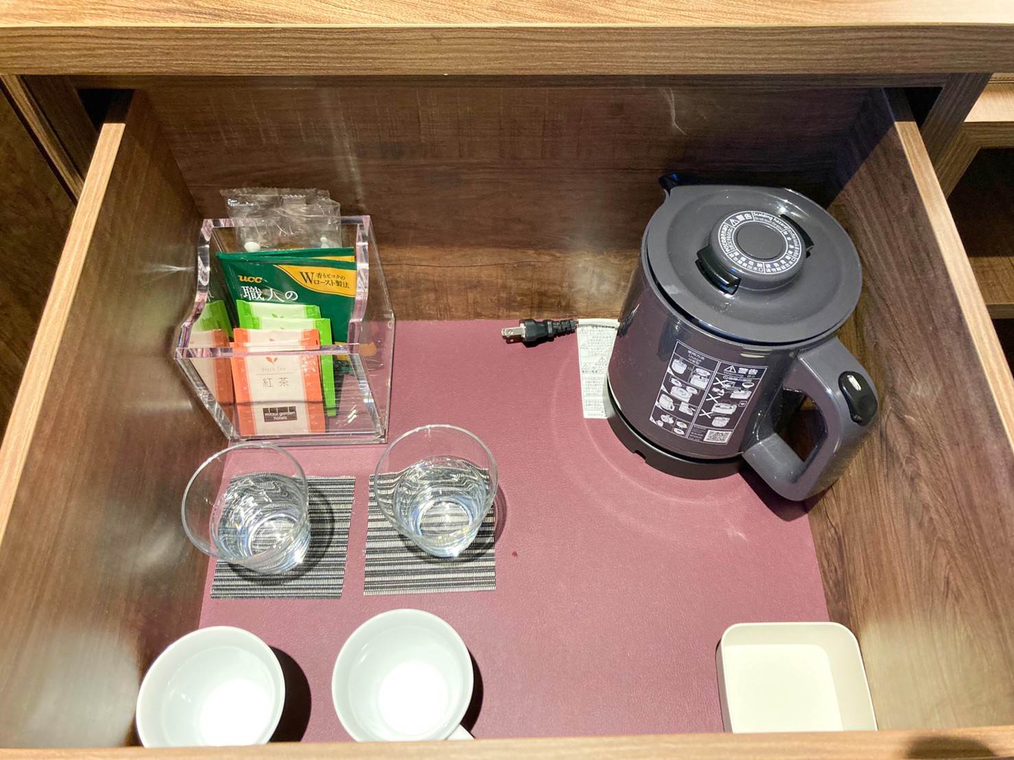▲飲み物系の備品はベッド横の棚の中にズラリ!アイス・ホットそれぞれのコップが合ったり、コーヒー・紅茶・緑茶のホットドリンクが揃い踏みだったりとその充実っぷりに相変わらずお世話になりました。