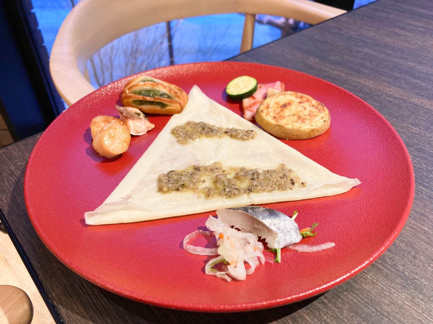 ▲そんな数々のラインナップの中から私が頂いたものをご紹介❗まずはやはり朝食クレープ。キノコのなんとかソースをベースに、ニシンやホタテやらを配置してみました。