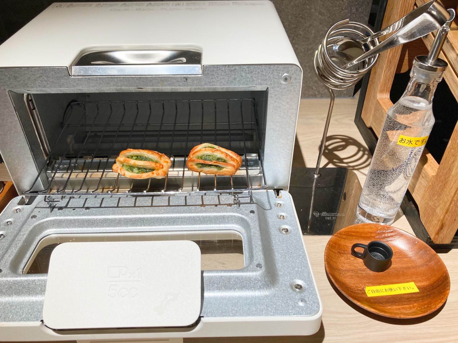 ▲そんなクレープエリアの近くにはパンコーナーも!4~5種類ある中から好きなものをバルミューダのトースタで温めていただけます◎ ここで少し驚いたことが。なんとバルミューダトースター備え付けの水用カップと水が用意されている…!!