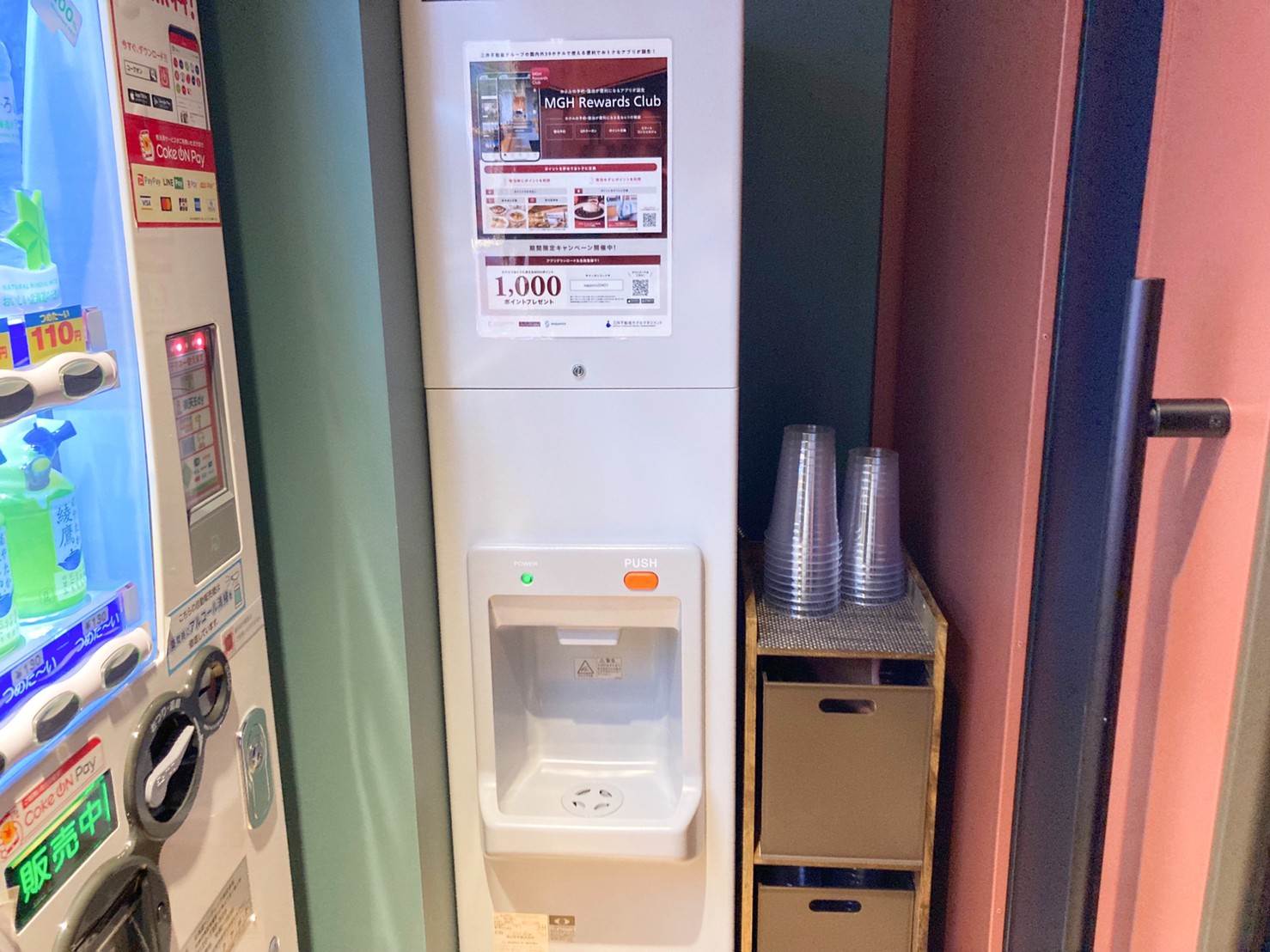 ▲同じく2階、自動販売機の隣には製氷機が用意されています。氷は備え付けのクリアカップで持ち帰るスタイル。