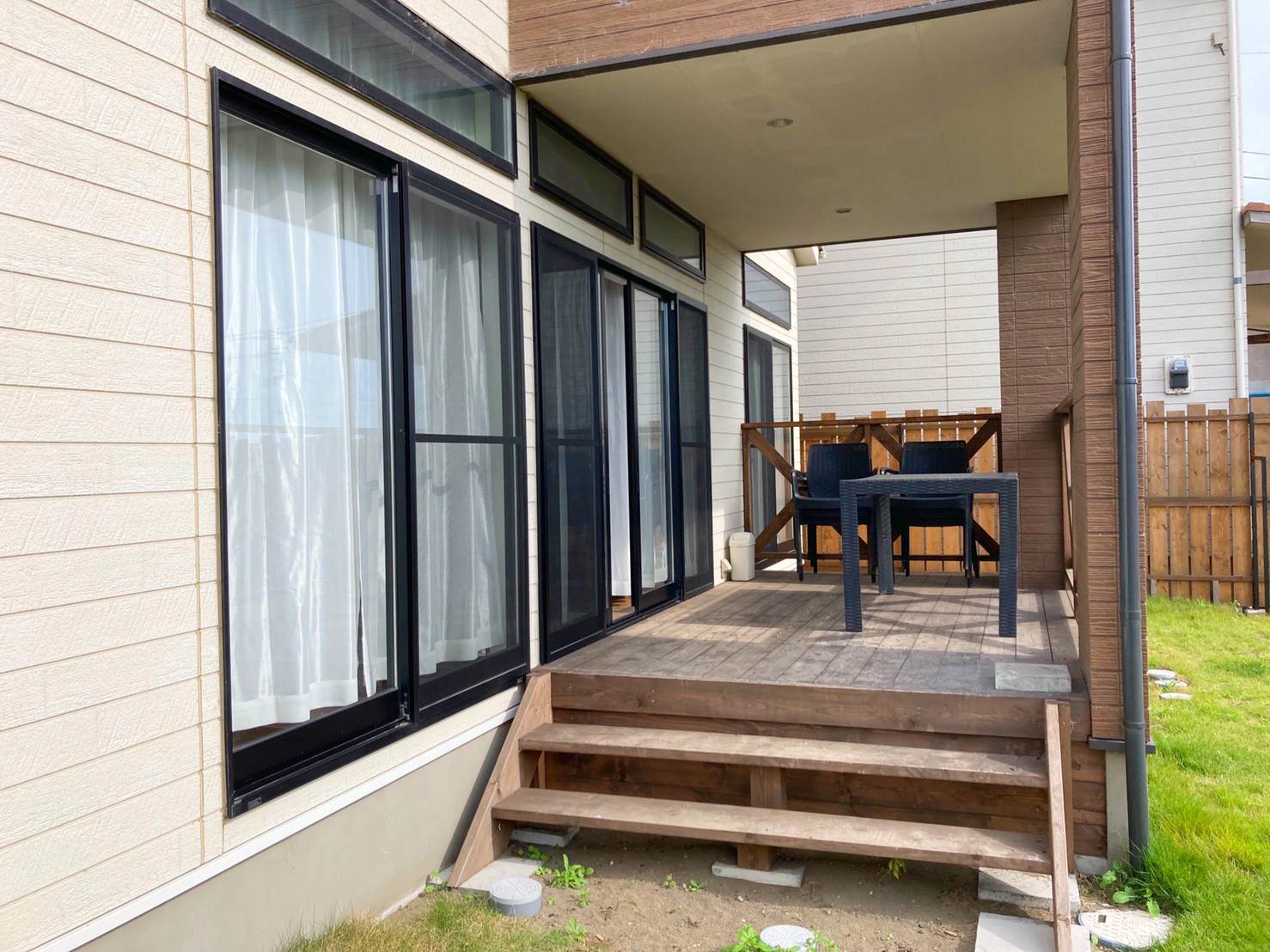 ▲このコテージ何よりのポイントは、お庭をプライベートドッグランとして自由に使えること!お庭の入り口はこんなテラスのようになっていて、日向ぼっこをしつつ愛犬を眺めるのにピッタリな感じでした。暑かったので日向ぼっこはしていませんが。。