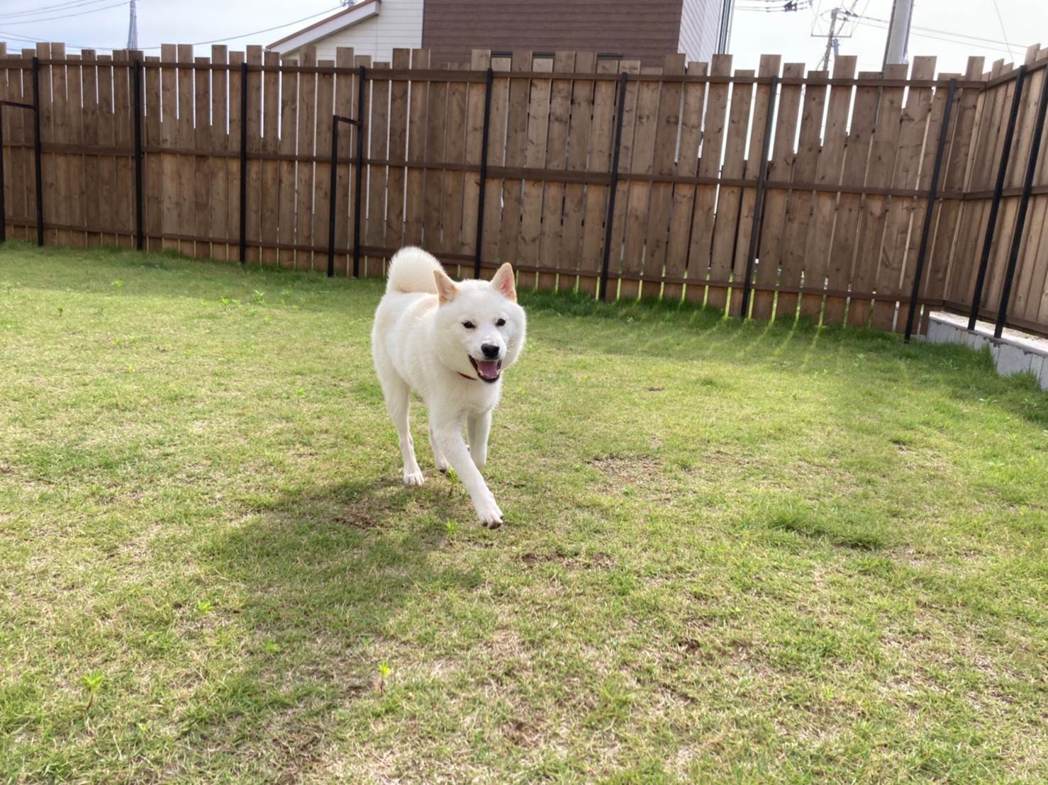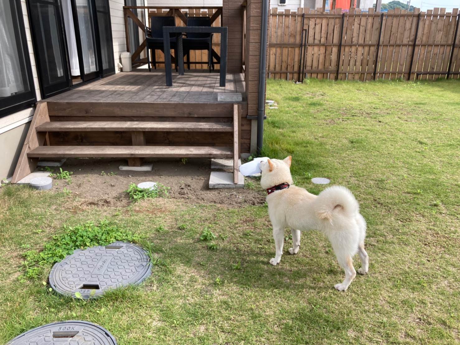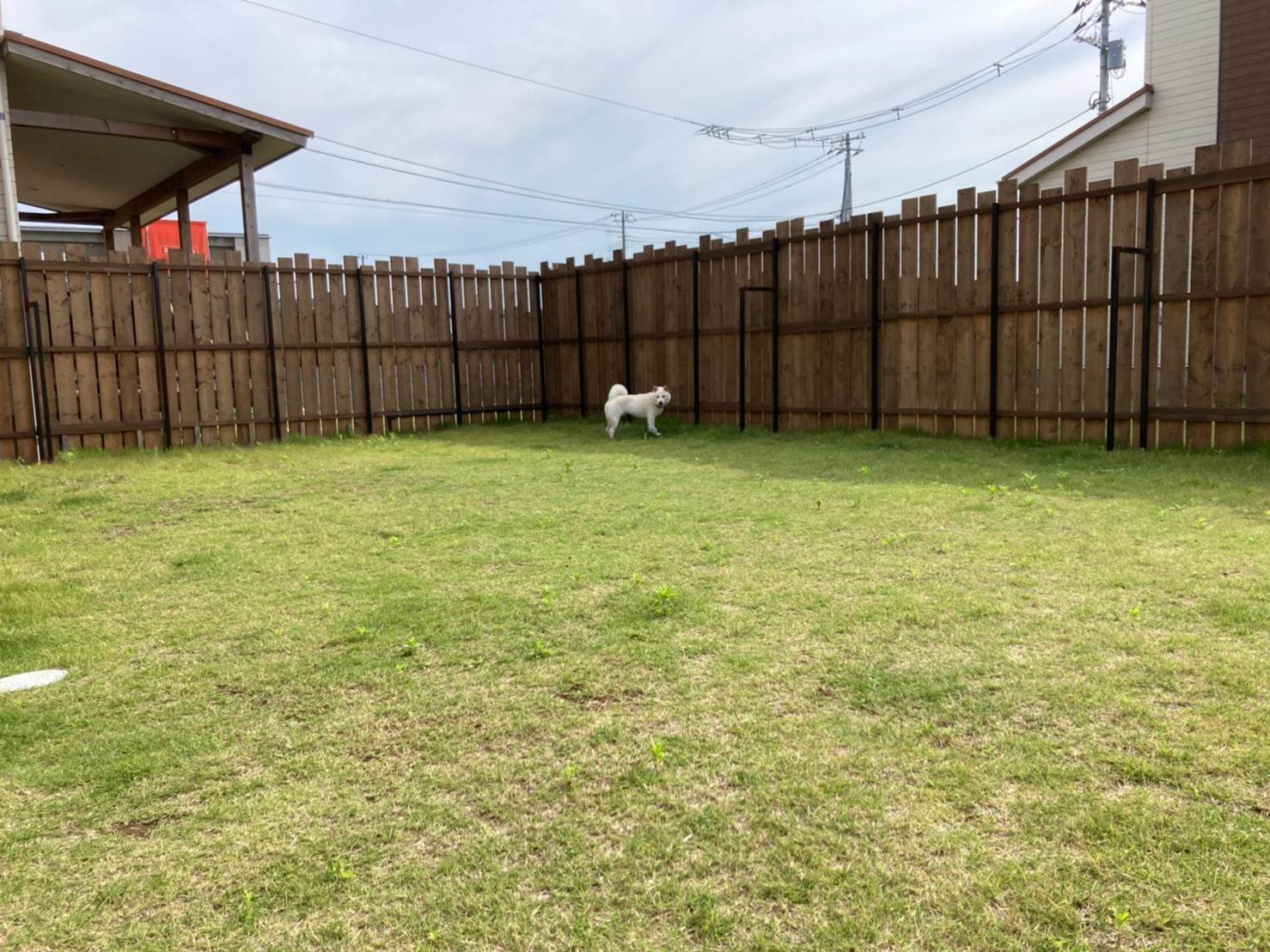 ▲お庭と言いつつ、結構な広さの芝生なので一緒に走り回れます。バテます。犬の体力には敵わない。。笑
