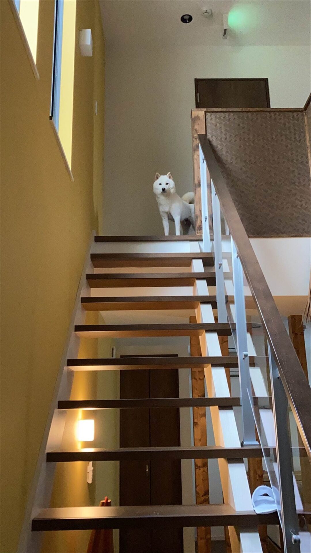 ▲楽しかった夜も開け、いよいよチェックアウトです。最初は吹き抜けの階段を怖がっていたわんこも、朝には気がついたら二階にいるほど慣れていました。