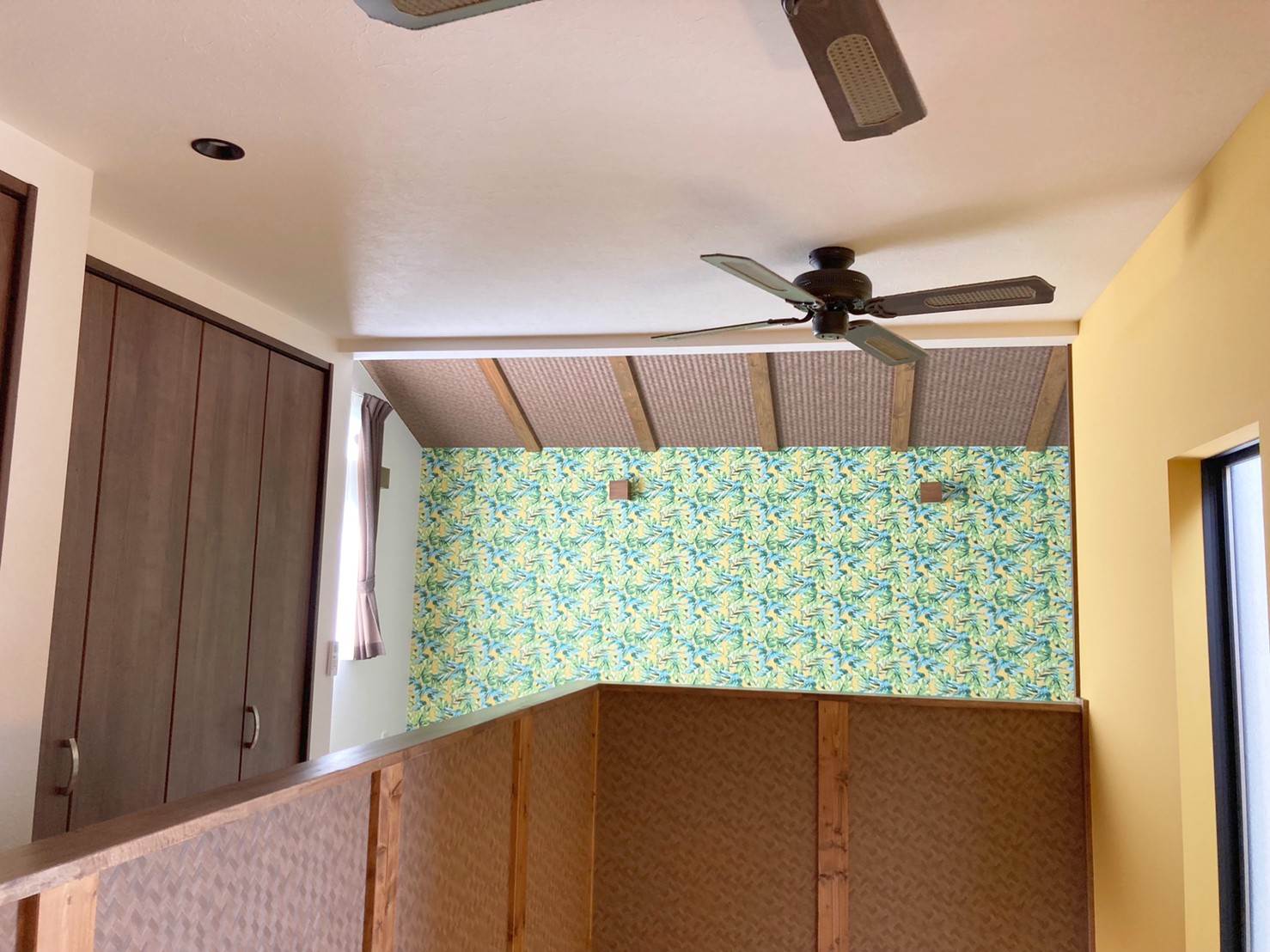 ▲ちゃんとこのお部屋単独でもエアコンが完備されているのでどんな気候でも快適!こうしてみると、イリマの黄色とベッドルームの壁紙の色合いが相まっていい感じです。