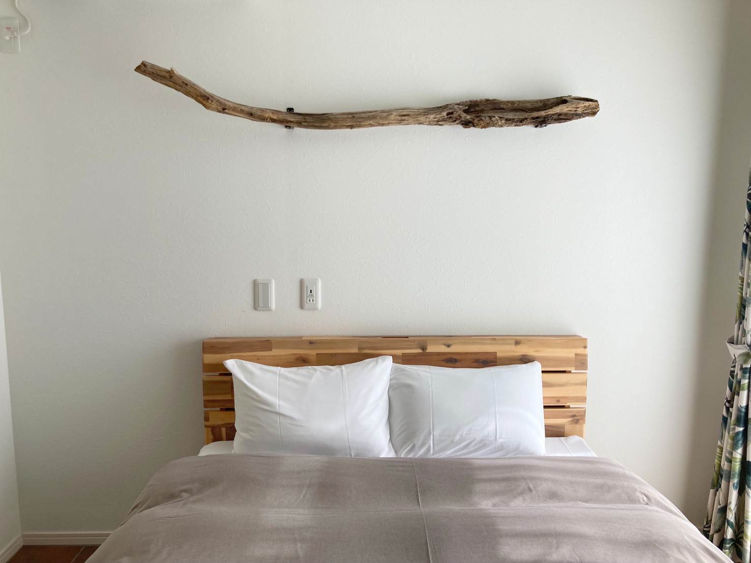 ▲ベッドの上にはこれまたハワイアンな倒木?のインテリアがありました。