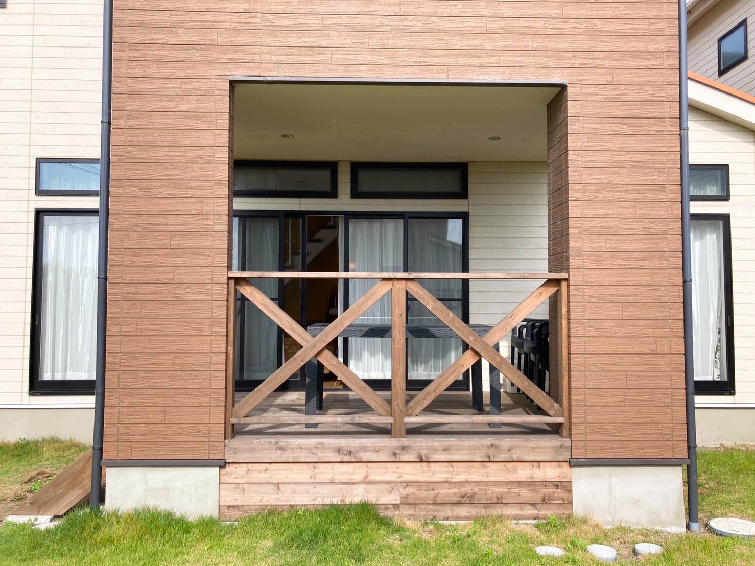 ▲そんなお庭にはリビングルームから直通でアクセスできます◎ ウッドデッキには人間がくつろぐこともできるデッキチェア・テーブルの用意もあります。