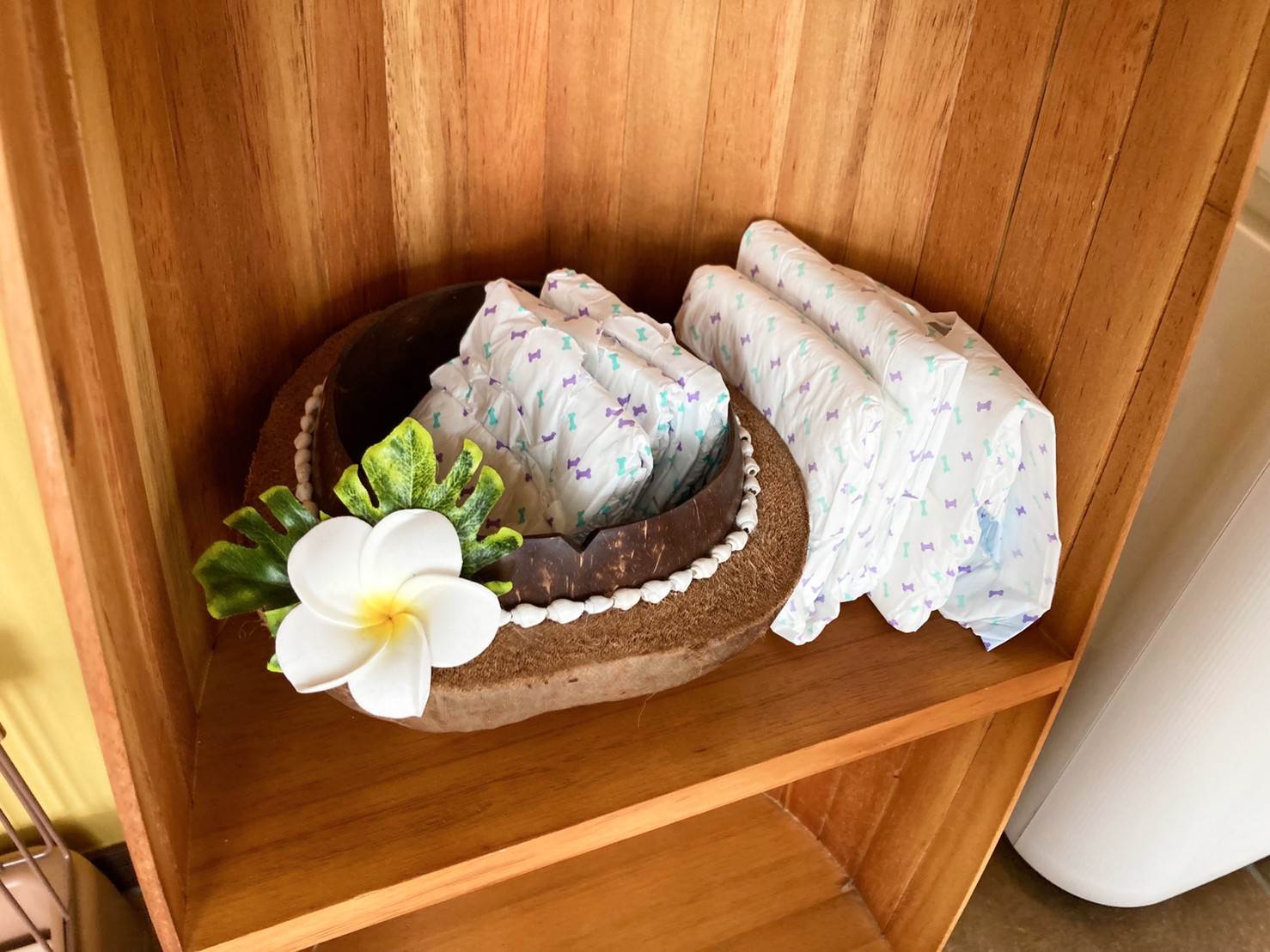 ▲ペット用のマナーベルトも用意されています。入れ物のハワイアンっぷりがおしゃれ!