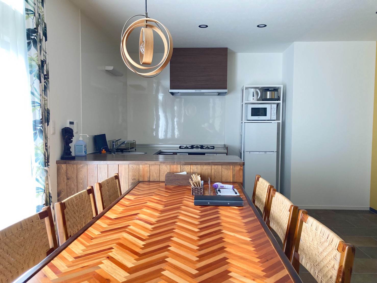 ▲コテージのメインルーム、リビングルームの様子がこちら。うーん、リゾート!!自宅では絶対にやらないであろう吊り下げ式おしゃれ照明だったり、余分(?)な木の柵?のような壁のような仕切りだったり。非日常感があってとても良いです。