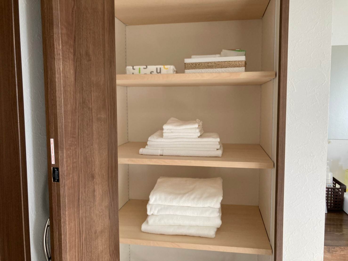 ▲タオル類は洗面台横の棚に格納されていました。