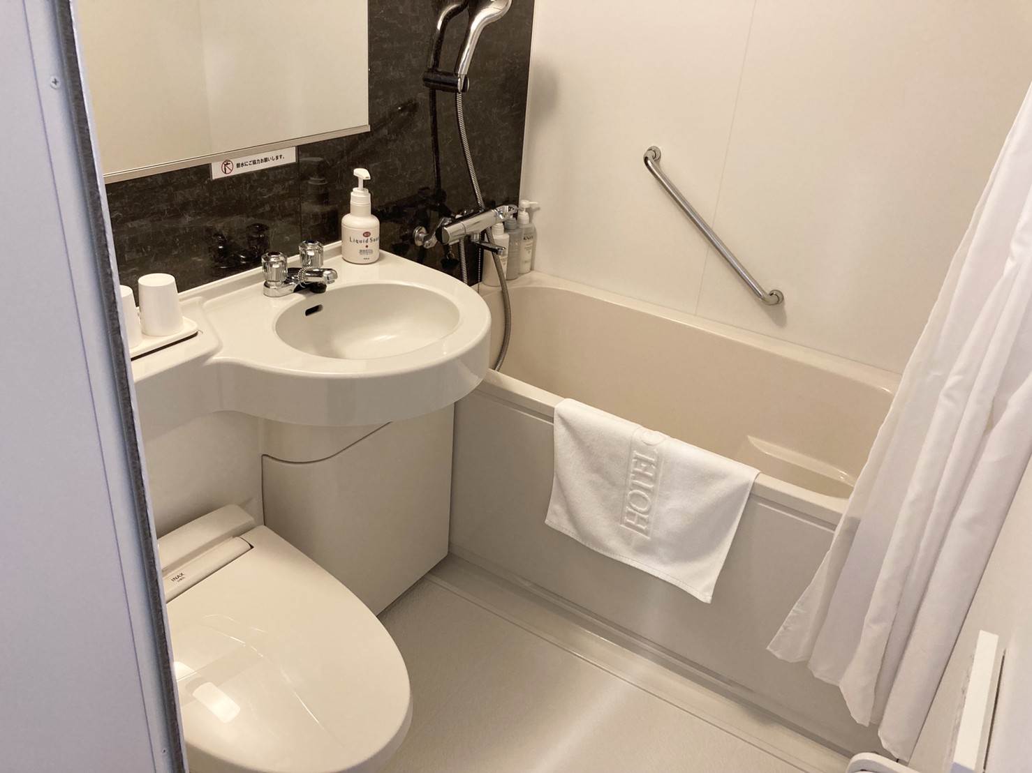 ▲バスルームはユニットバスタイプ。一般的なビジネスホテルらしいサイズ感で、ちょい狭めです。