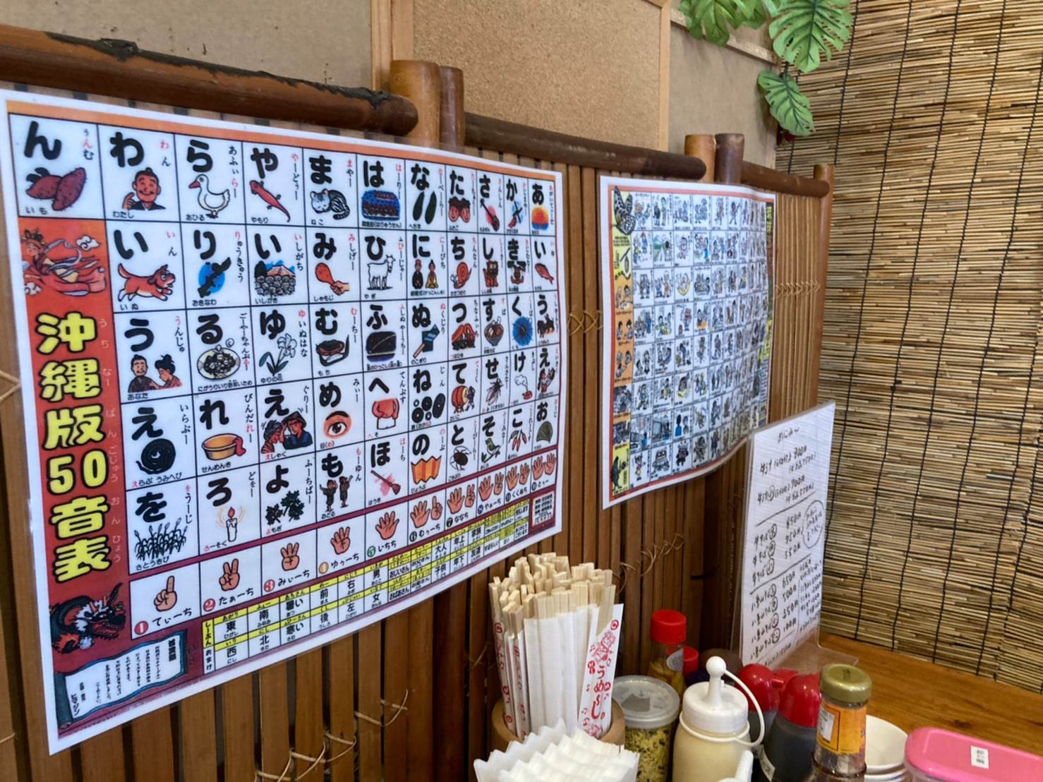 ▲客席には沖縄版50音表が貼ってあったのですが……、え、方言ってこんなに別言語なんでしたっけ。笑