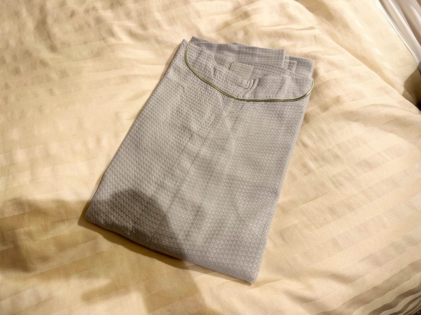 ▲フロントからピックした館内着は、大浴場でも使用可能。お風呂に行くときは館内着を着たまま行ってもOKです。