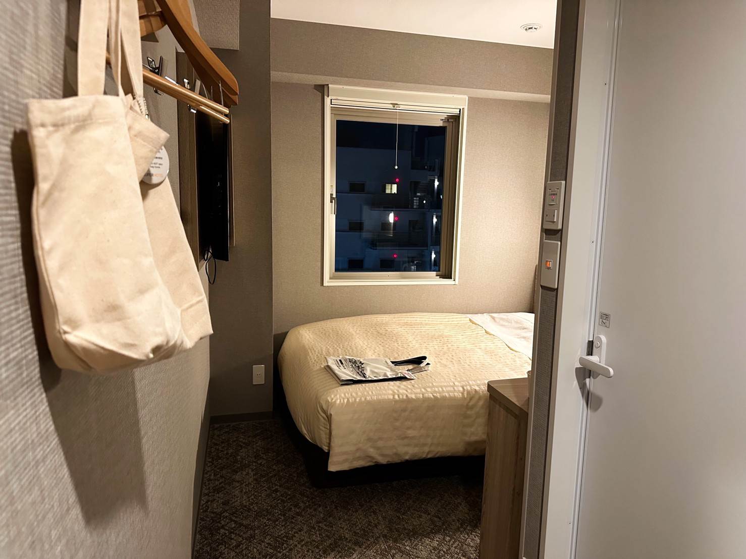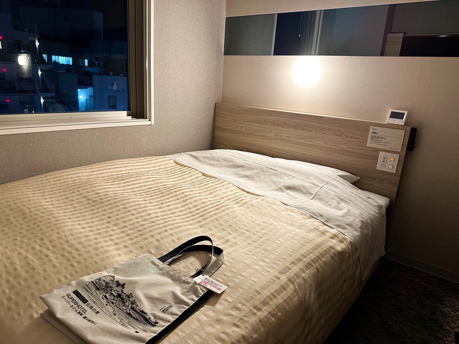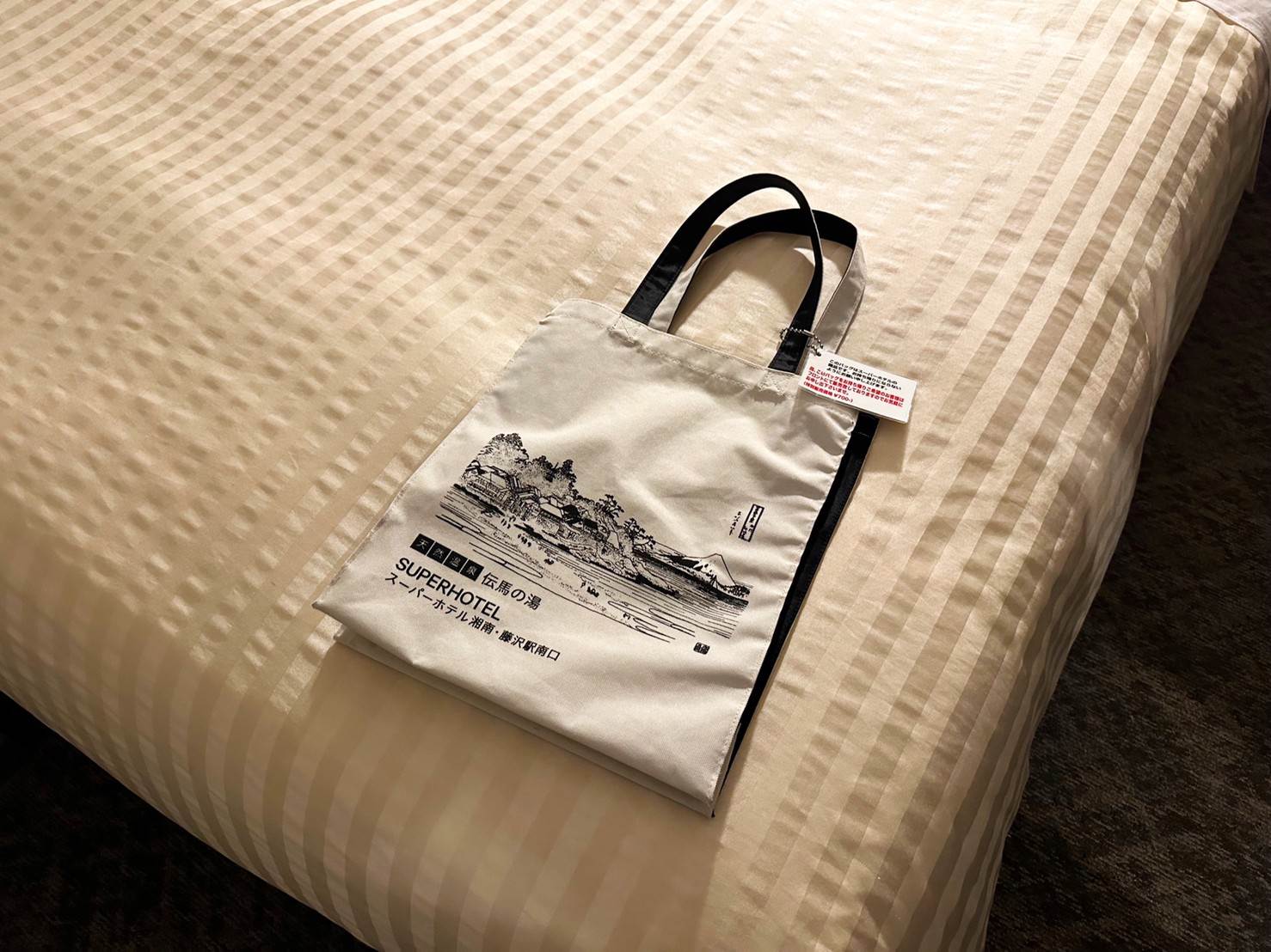 ▲ちなみに布バックはベッドの上にも用意されていました。大浴場付きホテルは意外とこういうバッグは備え付けられていないため、タオルや着替えの持ち込みに悩みがちですが、スーパーホテル藤沢はその点GOODですね!
