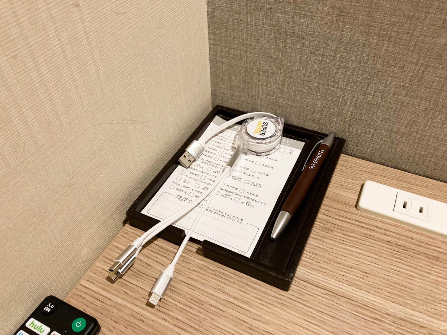 ▲デスクの上にはマルチに利用できる特製(?)ケーブルが用意されていました!モバイルバッテリーの充電に必要なコード等は忘れがちなためありがたい。
