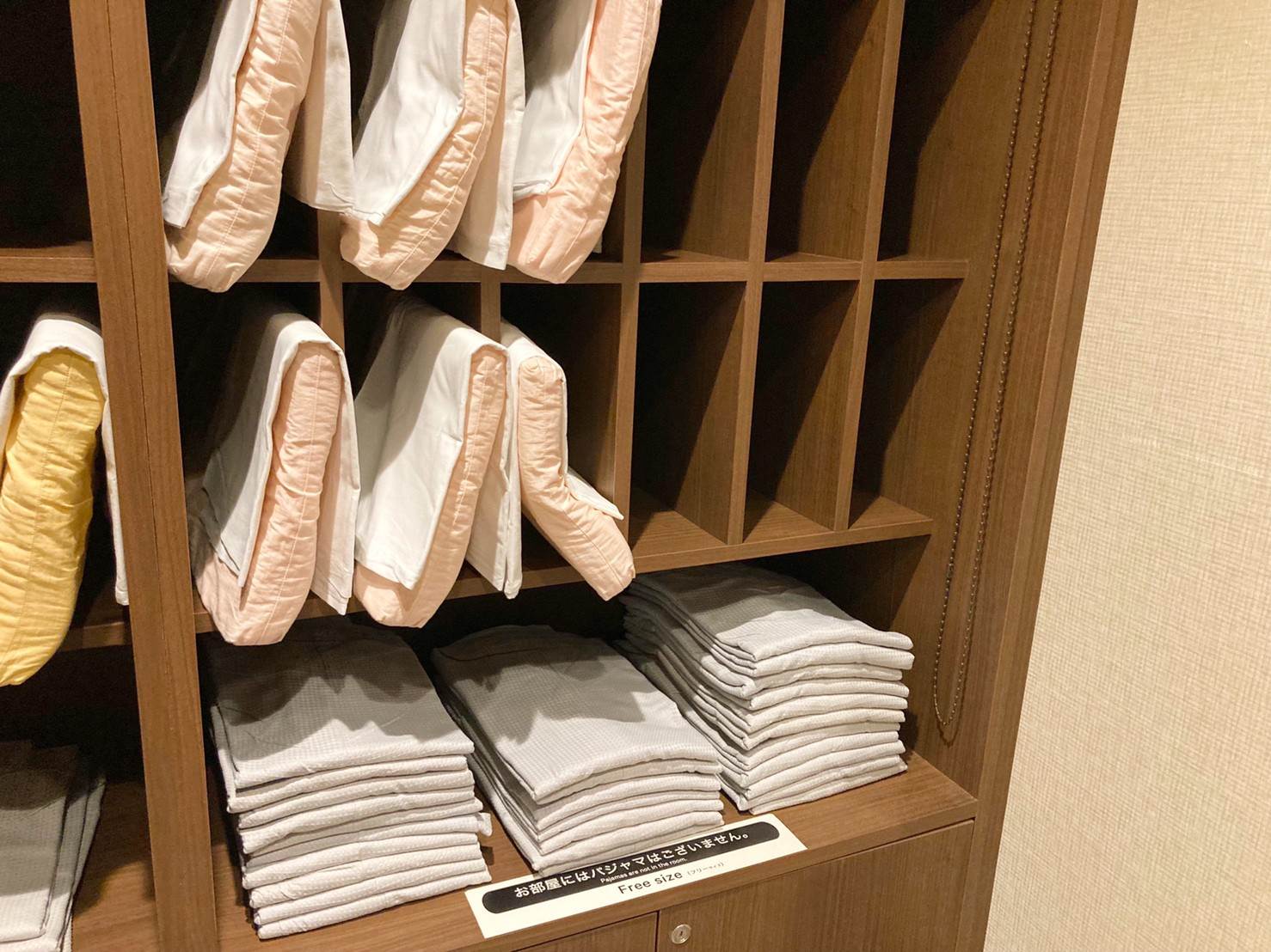 ▲チェックインを済ませた後に、館内着を受け取ります。枕は好みの枕をピックアップできるスタイル!客室にも用意されているのでこだわりがある方に優しい仕組みです。