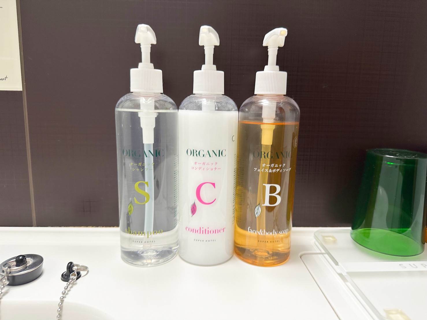 ▲シャンプー・コンディショナー・ボディソープが用意されています。ホテルコンセプトと合致している”ORANIC”の表記が。