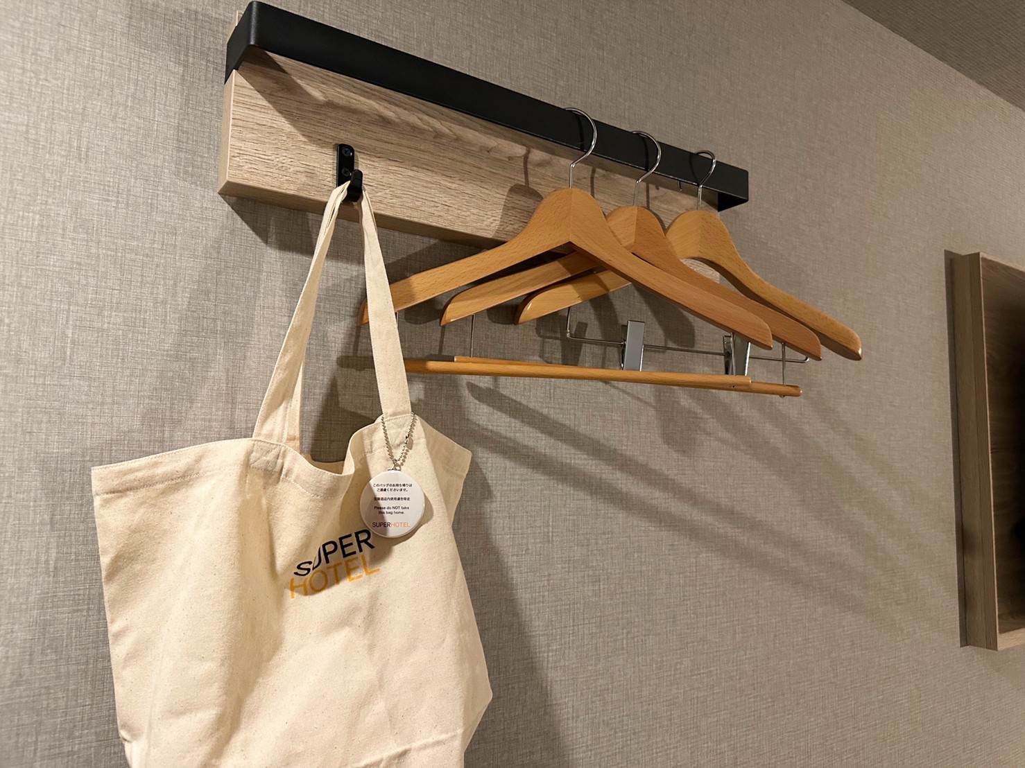 ▲廊下のスペースにハンガーが用意されています。備え付けの布バッグは館内で使用可能。大浴場にタオルや着替えを持っていくときに重宝しました!