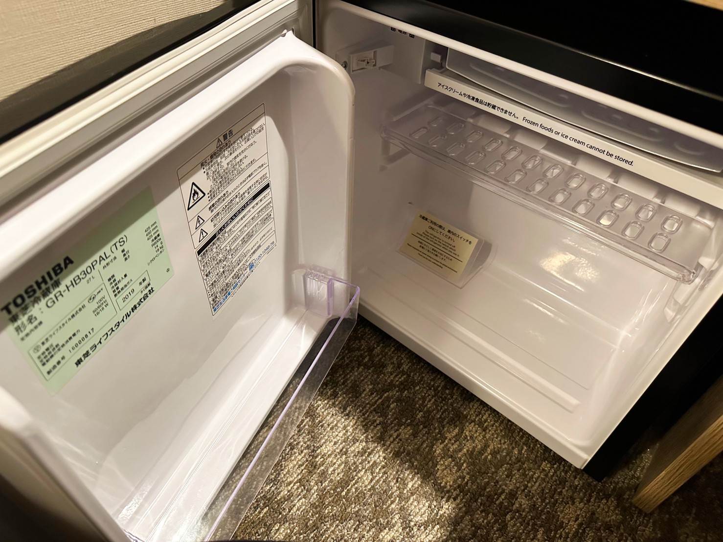 ▲客室に備え付けられている冷蔵庫はコンパクトサイズ。はじめは電源OFFになっているので、使用する場合は電源ONをお忘れなく。