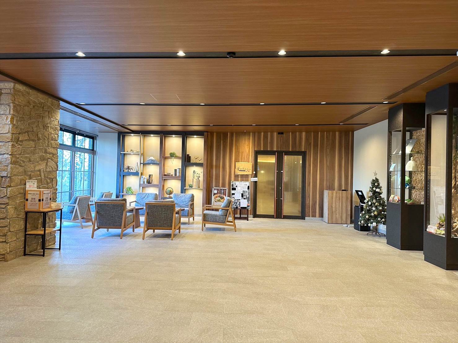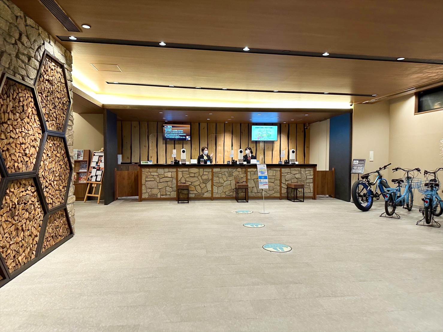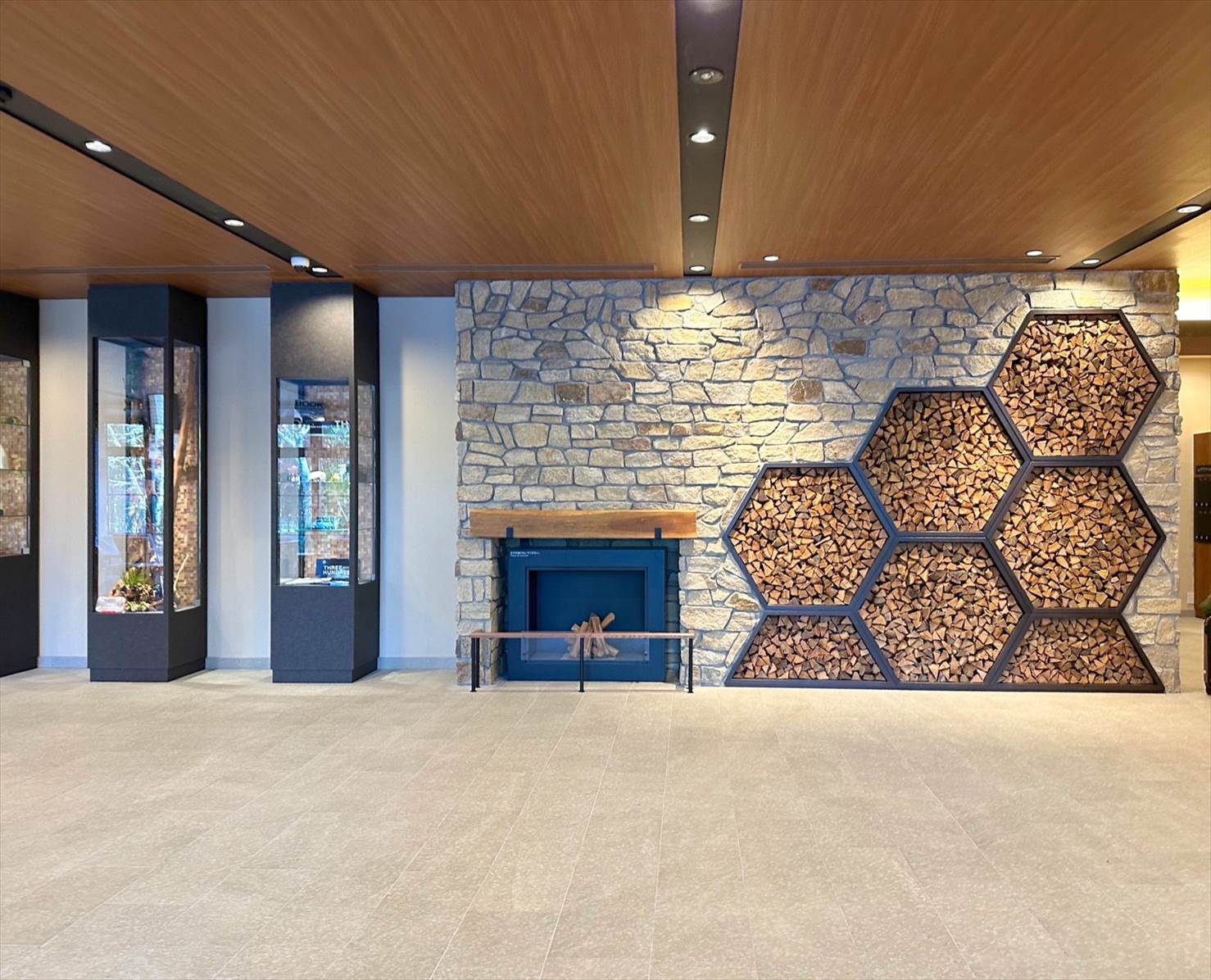 ▲暖炉?のようなオブジェがあったり、木をあしらった壁面がおしゃれで良い。