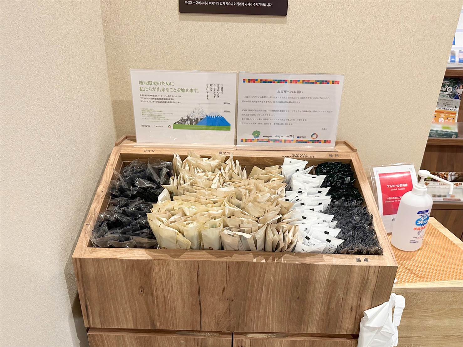 ▲客室内には歯ブラシを始めとしたプラスチック系のアメニティは用意されておらず、フロント横のバーから取っていくスタイルです。