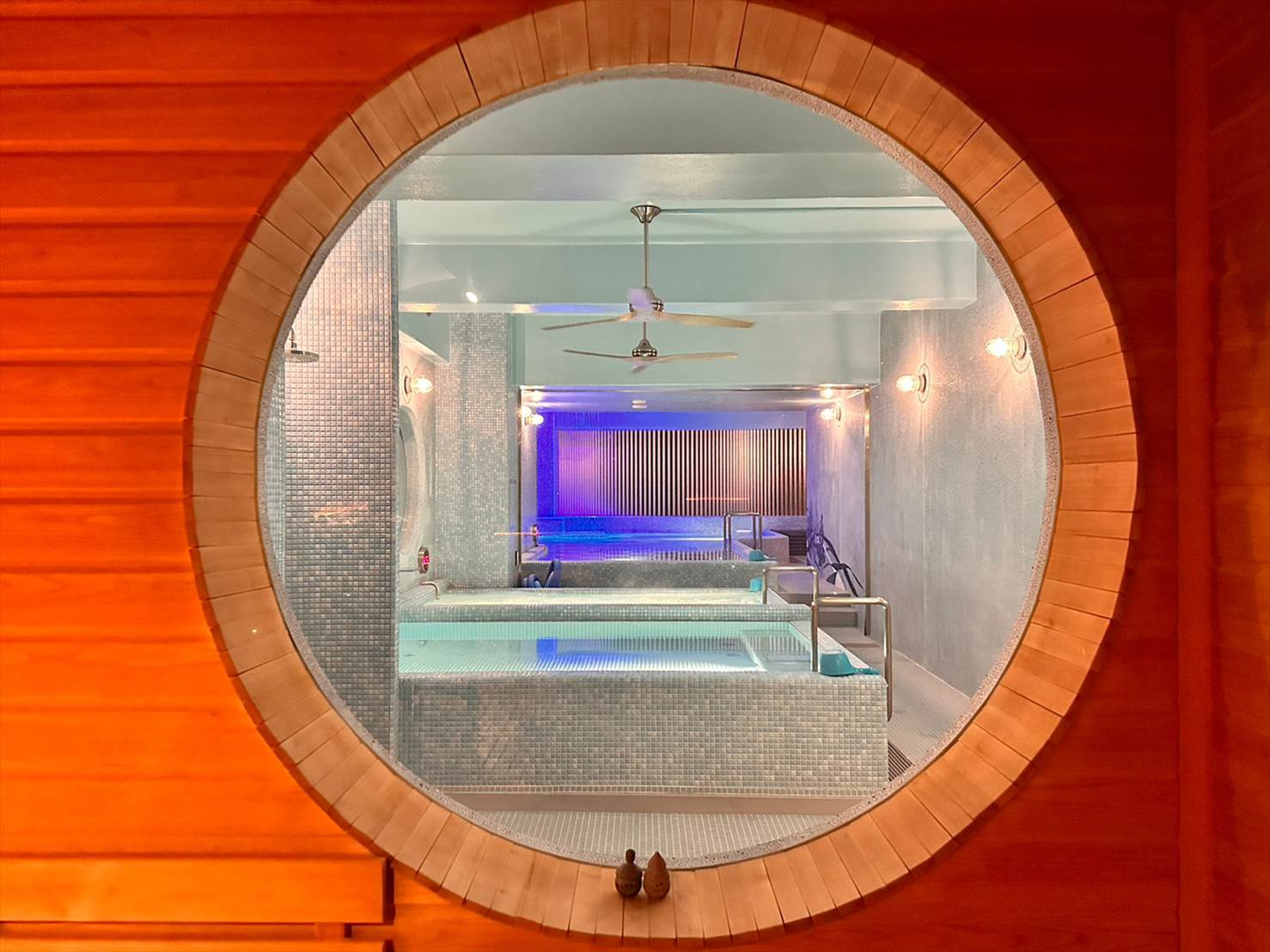 ▲サウナの中からはスパの様子を一望することができます。サウナ内の温かい暖色と、スパ側の寒色とのコントラストがまたおしゃれ。