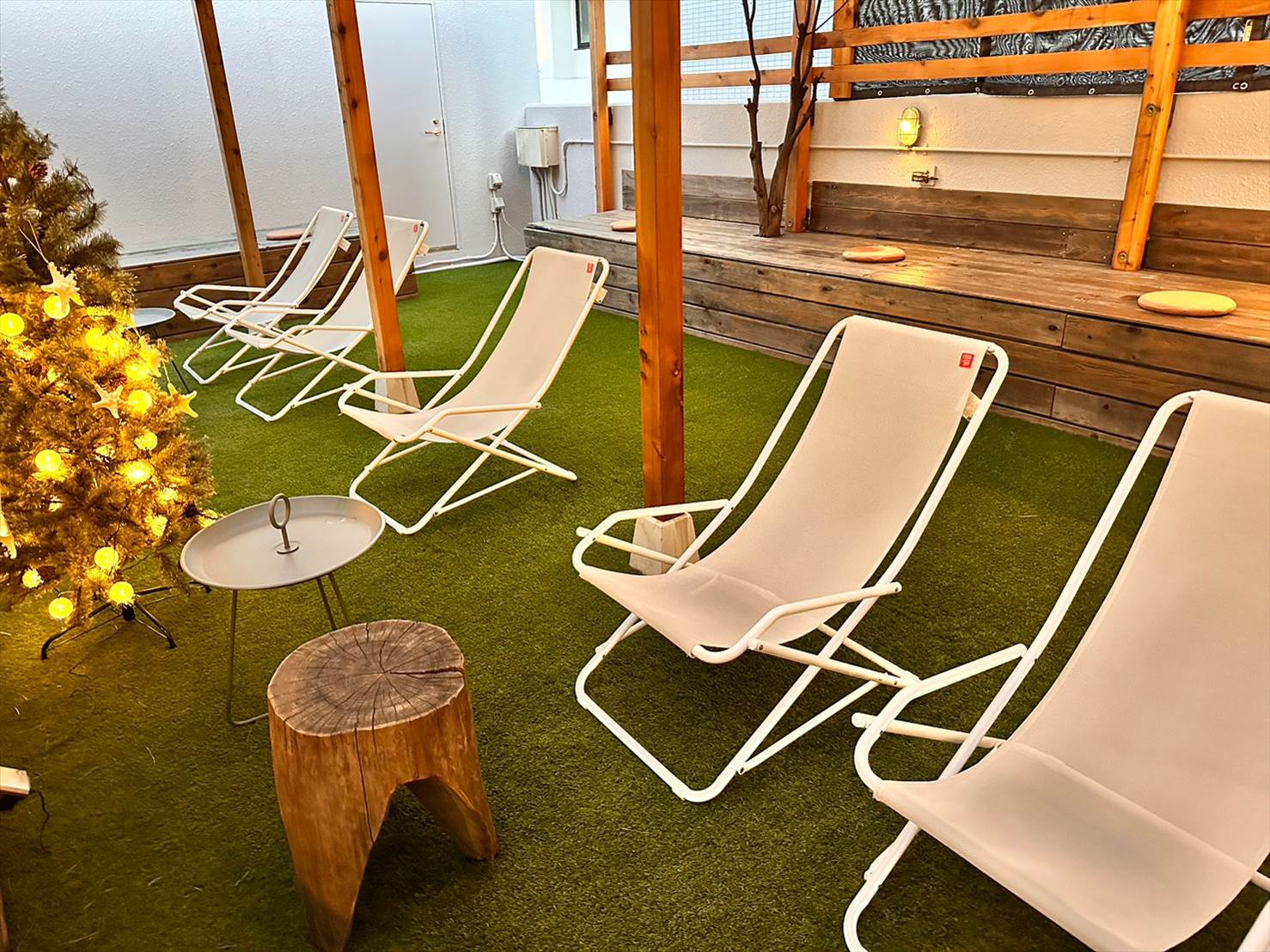 ▲階段を上った先はこんな感じの外気浴スペース!心地よさそうな椅子やら、おしゃれな照明が並ぶ素敵空間。