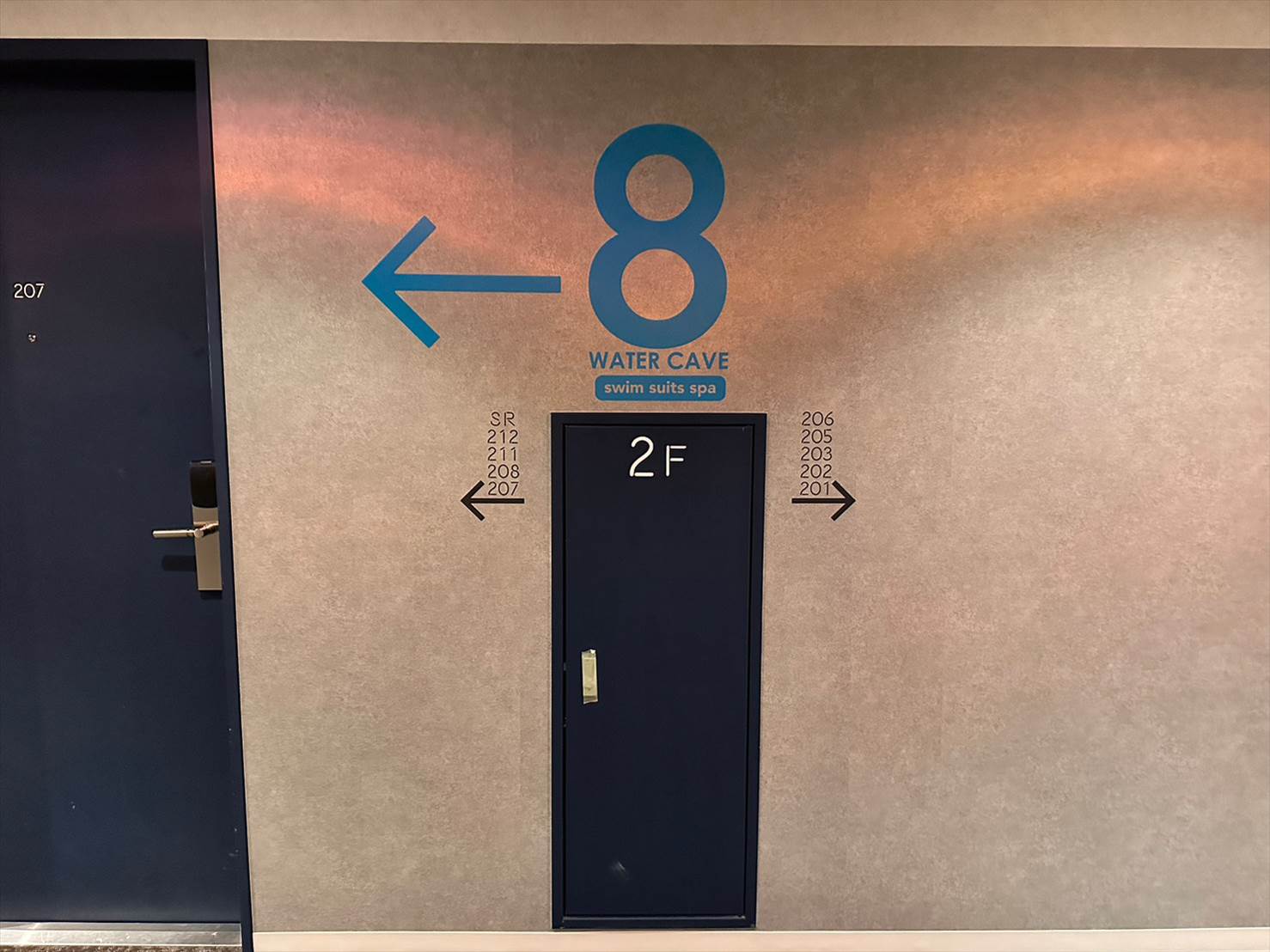 ▲客室から水着を着込み、フロントに立ち寄ってロッカーキーを入手した後は、いざ2階の8 WATER CAVEへ。